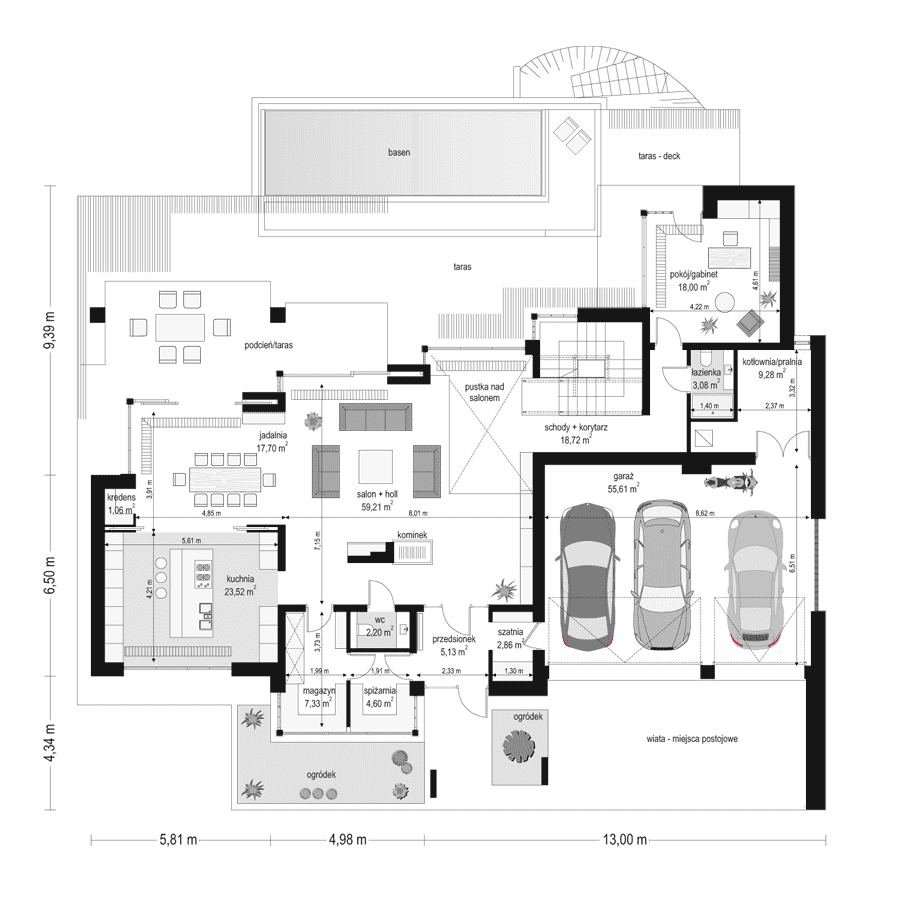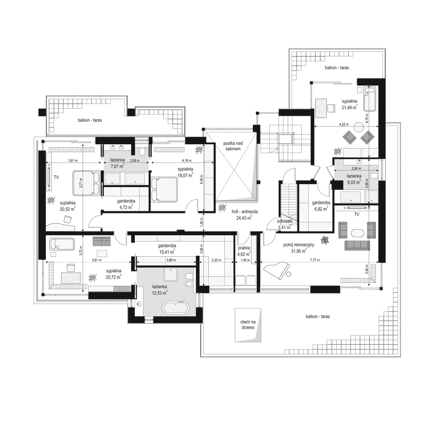 - Zmianę funkcji, ilości i usytuowania poszczególnych pomieszczeń na dowolnej kondygnacji w projekcie.