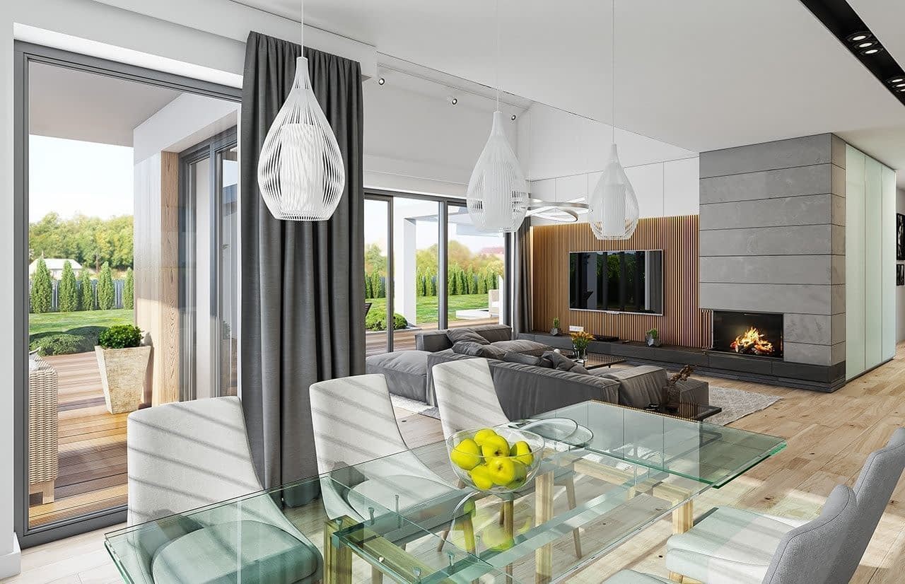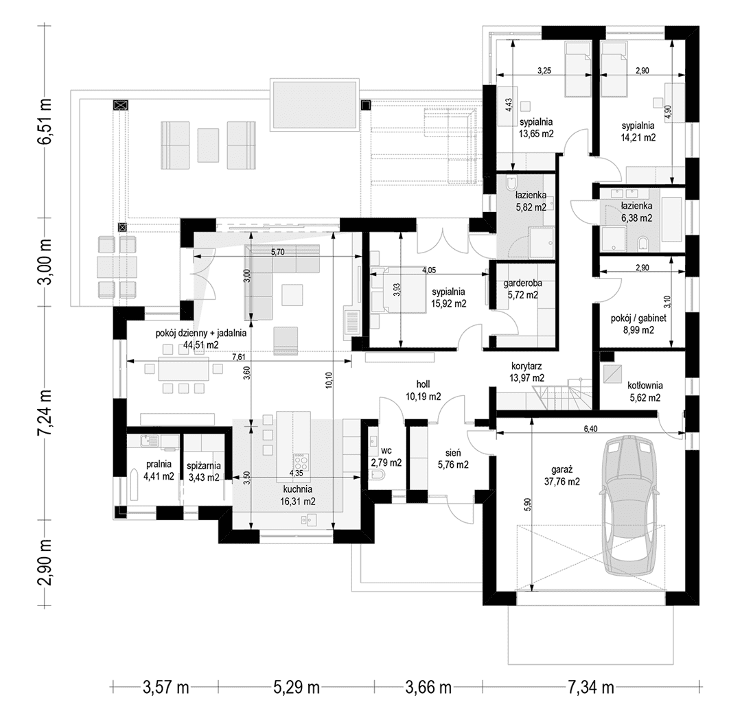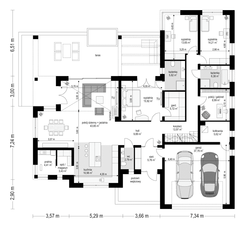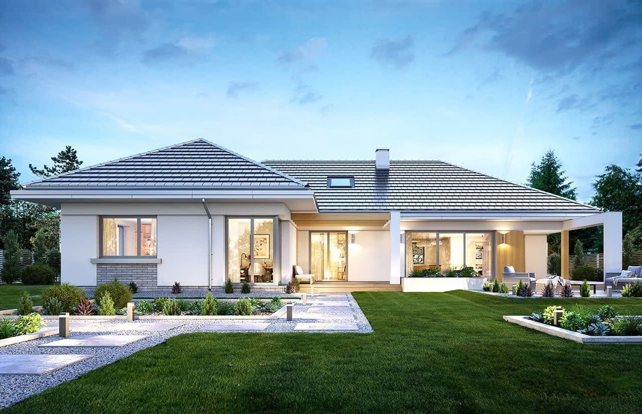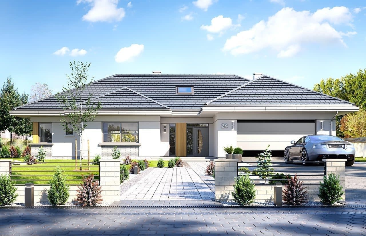 Projekt domu Willa Parterowa to reprezentacyjny, parterowy dom jednorodzinny dla 4-5 osobowej rodziny. Projekt domu Willa Parterowa to prawdziwa komfortowa willa o nieprzeciętnej funkcjonalności przeznaczona dla Inwestorów zdecydowanych żyć na parterze - bez biegania po schodach.Projekt domu Willa ParterowaDom jednorodzinny Willa Parterowa, mimo, że nie jest wielki i jego powierzchnia użytkowa to nieco ponad 170 m2, zaprojektowano z amerykańskim rozmachem. Od samego wejścia Willa Parterowa wita nas szeroka efektowna elewacja frontowa, z pięknie zaakcentowanymi drzwiami wejściowymi. Od strony ogrodowej jest jeszcze lepiej - układająca się w literę "L" bryła domostwa z tarasem – z wewnętrznym patio, częściowym zadaszeniem oraz pergolą. Świetne miejsce na domowe przyjęcia, ale też na spokojny wieczorny relaks dla wszystkich domowników. Budynek Willa Parterowa zaprojektowaliśmy na planie litery "T", z główną prostokątną bryłą przykrytą czterospadowym dachem i dobudowanymi częściami dużego garażu i sypialni.Wnętrze domu Willa ParterowaStyl Willi Parterowej to umiarkowana nowoczesność. Dzięki dużym przeszkleniom, kolorystyce i zastosowanym materiałom budowlanym dom Willa Parterowa wygląda nowocześnie, ale nie ekstrawagancko. Do wnętrza projektu Willa Parterowa wchodzimy przez przedsionek do holu i stamtąd w jedną stronę do części dziennej - z pięknym pokojem dziennym, jadalnią i kuchnią, a w drugą stronę do części nocnej domu. Salon ze ścianą kominkowo – telewizyjną połączony jest z tarasem szerokimi przesuwnymi przeszkleniami. Nad salonem projektu Willa Parterowa zaplanowano otwarcie przestrzenne – pustkę, dzięki której wnętrze domu wydaje się znacznie większe. W wersji domku z zagospodarowanym strychem na poddaszu zaplanowano powyżej balustradę i antresolę. W wersji budynku ze strychem nieużytkowym - po prostu pustkę nad salonem. W jadalni zaplanowano całą ścianę na kredens – rzadko spotykaną wygodę. W kuchni zaprojektowano dużą centralną wyspę, a obok kuchni pomieszczenia spiżarki i pralni - po amerykańsku, Pani domu ma pod ręką wszystkie urządzenia. W części nocnej domu mieści się apartament rodziców z garderobą i łazienką, dwie sypialnie dzieci z szafami wbudowanymi i łazienką, oraz dodatkowy pokój, który może być sypialnią albo gabinetem.Projekt Willa Parterowa - część gospodarczaW gotowym projekcie domu Willa Parterowa, od frontu domu przewidziano jeszcze duży garaż na dwa samochody i kotłownię. Strych budynku Willa Parterowa może pozostać przestrzenią nieużytkową - domowym magazynem rzeczy różnych, albo można go zaadaptować na powierzchnię użytkową, uzyskując tym samym dodatkowe 35 m2.Projekt domu Willa Parterowa - budowaGotowy projekt domu jednorodzinnego Willa Parterowa to dzięki optymalnie dobranym materiałom budowlanym i izolacji budynek energooszczędny. Dzięki temu będzie niedrogi w użytkowaniu przez domowników. Konstrukcja domu Willa Parterowa jest nieskomplikowana, więc koszty budowy domu Willa Parterowa są niskie. Według naszych kosztorysantów koszt budowy domu Willa Parterowa to 343971 zł za stan surowy zamknięty, a koszty budowy za stan pod klucz to 695 tys zł. Projekt Willa Parterowa to świetna propozycja dla Inwestorów marzących o kontakcie z ogrodem i przyrodą, o komfortowym domostwie na jednej podłodze - bez chodzenia po schodach. Z pewnością dom jednorodzinny Willa Parterowa przeznaczony jest dla osób mających trochę większą działkę o wymiarach min 24,75x24,84m i powierzchni minimum 700-800 m2.