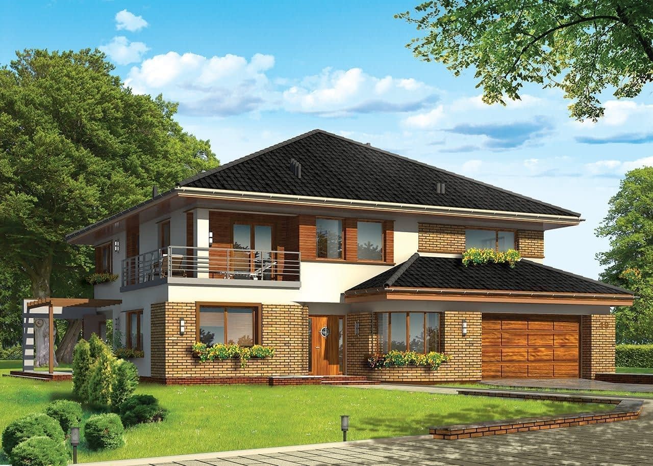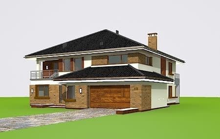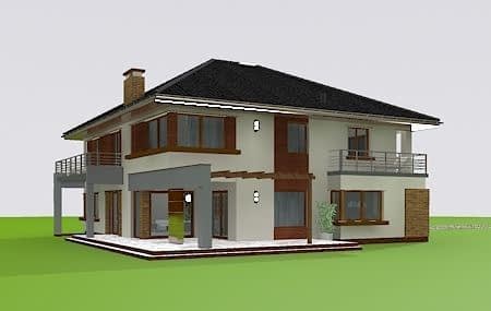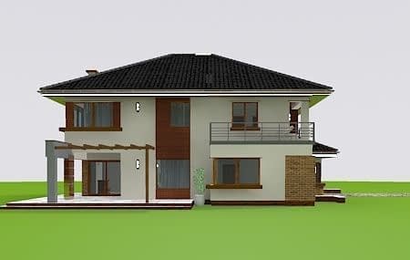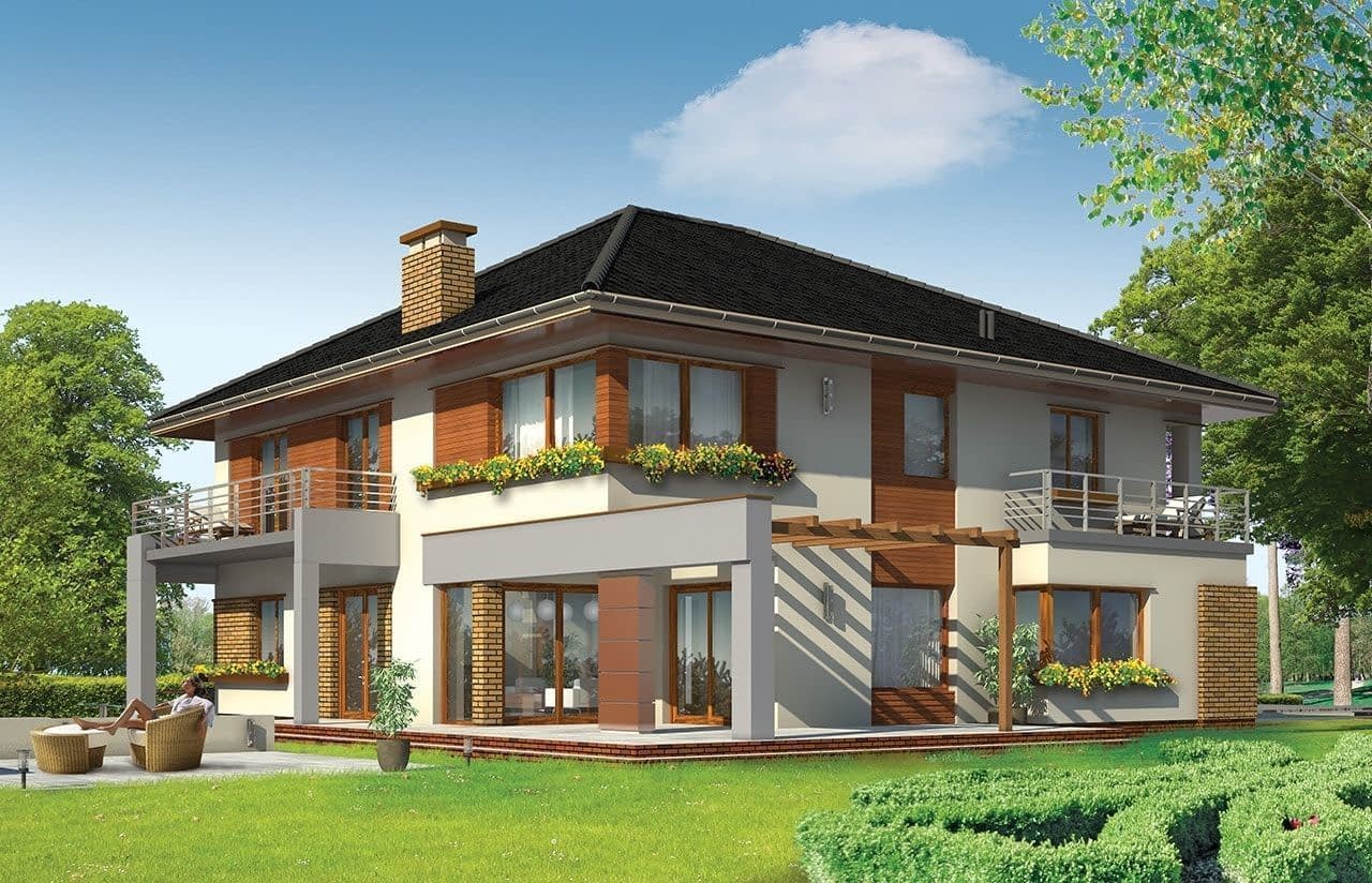 Projekt domu Wiola to budynek jednorodzinny dla pięcio-sześcioosobowej, dużej rodziny. Piętrowy przykryty czterospadowym łagodnym dachem z dachówki ceramicznej. Wygląd zewnętrzny domu utrzymany jest w stylu podmiejskiej luksusowej willi - nowoczesnej, ale jednocześnie z elementami tradycji. Wnętrze domu ukształtowano z podziałem na część ogólną, dzienną na parterze, z salonem, jadalnią, półotwartym holem z pięknymi schodami, oraz część prywatną, nocną - na piętrze, z czterema sypialniami i dodatkowym pokojem. W projekcie domu Wiola sypialnia rodziców stanowi osobny apartament z własną oddzielną łazienką i garderobą. Na parterze, oprócz części dziennej salonu, jadalni i holu zaprojektowano gabinet i dodatkowy pokój - sypialnię gościnną. Z salonu i jadalni zaplanowano szerokie przeszklone otwarcia na ogród, przez dwa niezależne tarasy, podcień oraz pergolę. Pracownia posiada projekt domu Wiola również w odbiciu lustrzanym.