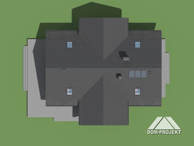 Dom z bali. Na parterze duży salon z kominkiem , wyjściem na taras i schodami na poddasze. Obok salonu duża otwarta kuchnia i jadalnia. Nad dużą częścią salonu otwarta przestrzeń. Pokój, łazienka, pomieszczenie gospodarcze, pomieszczenie rekreacyjne z sauną, wiatrołap i garderoba. Na poddaszu cztery pokoje, łazienka, komunikacja, pustka nad częścią salonu i dwa balkony.Rzuty