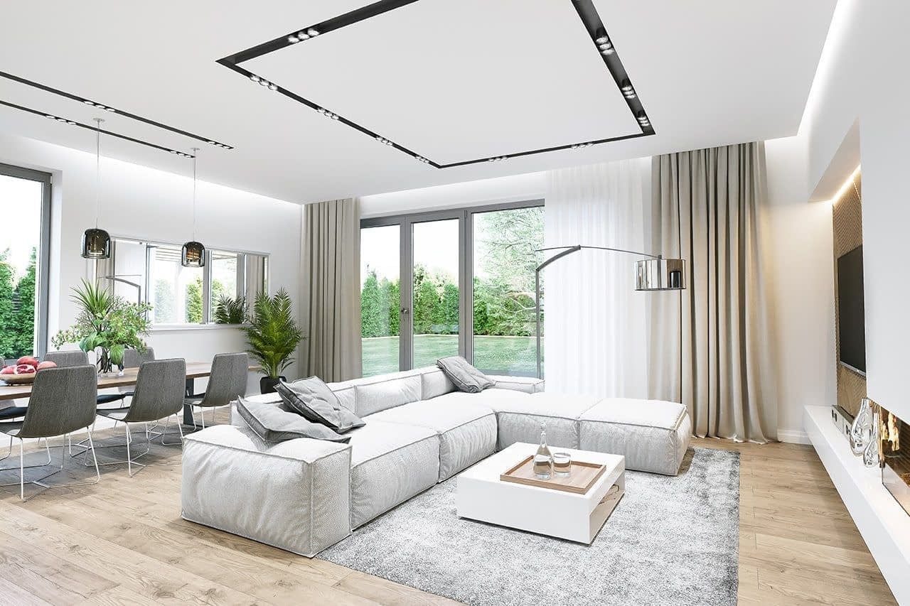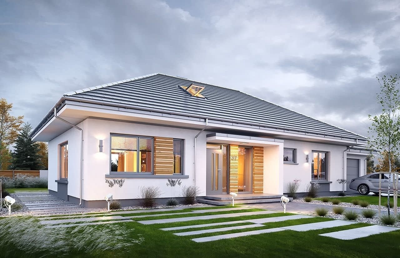 Projekt domu Wymarzony 11 to uroczy dom jednorodzinny z kolekcji naszych projektów „Wymarzonych”. Jest to jedna z najmniej rozbudowanych wersji z projektów tej serii, jednocześnie jedna z najładniejszych i najzgrabniejszych. Prostokątną bryłę z garażem przekryto dwoma dachami czterospadowymi o kącie nachylenia 30 stopni. Projekt domu Wymarzony 11 ma nowoczesną stylistykę i łączy tradycyjną sylwetkę z nowoczesnymi detalami i materiałami wykończeniowymi. Połączenie białych tynkowanych ścian z szarymi dodatkami, szarą dachówką i ramami okien, dają pełen elegancji i sznytu wygląd zewnętrzny budynku. Główne ozdoby elewacji to : wejście z daszkiem w kształcie litery „L” i ładnymi drzwiami frontowymi, oraz strefa tarasowa od strony ogrodu z dużym przeszkleniem z pokoju dziennego i z pergolą. Dom przeznaczony jest na działkę z ogrodem i oświetleniem słonecznym z tyłu lub z boku budynku. Wnętrze domu mieści w sobie wygodną cześć dzienną, oraz aż pięć dodatkowych pokoi, co przy niewielkiej powierzchni domu jest bardzo dobrym wynikiem. Dom Wymarzony 11 może być swobodnie użytkowany nawet przez rodzinę 2 + 4. Pokoje mogą być zagospodarowane jako sypialnie dziecięce. Jeden z pokoi może pozostać domowym biurem / gabinetem. Do wnętrza wchodzimy wygodnym przedsionkiem do części dziennej, z salonem, jadalnią i otwartą kuchnią. W salonie przewidziano ścianę kominkowo – telewizyjną, miejsce na wygodny wypoczynek, a szerokie drzwi balkonowe otwierają pokój dzienny na taras i ogród. Z salonu przez hol- korytarz przedostajemy się do części domu z sypialnią rodziców z garderoba, oraz sypianiami dzieci. Dalej dom łączy się z częścią garażowo-gospodarczą budynku, przez pomieszczenie gospodarcze, z garażem i kotłownią. Strych nad parterem zaprojektowano jako przestrzeń magazynową, na którą dostajemy się schodkami drabinkowymi. Projekt domu Wymarzony 11 to elegancki, komfortowy dom dla cztero-sześcioosobowej rodziny. Jego funkcjonalność i praktyczność zagospodarowania wnętrza łączy się z solidną konstrukcją i prostotą architektury. Budynek jest energooszczędny, ma łatwą w budowie konstrukcję, będzie niedrogi w utrzymaniu. Zapraszamy do zapoznania się z pełną ofertą pracowni MG Projekt tej serii: Wymarzony, Wymarzony 2, Wymarzony 3, Wymarzony 4, Wymarzony 5, Wymarzony 6, Wymarzony 7, Wymarzony 8, Wymarzony 9, Wymarzony 10.