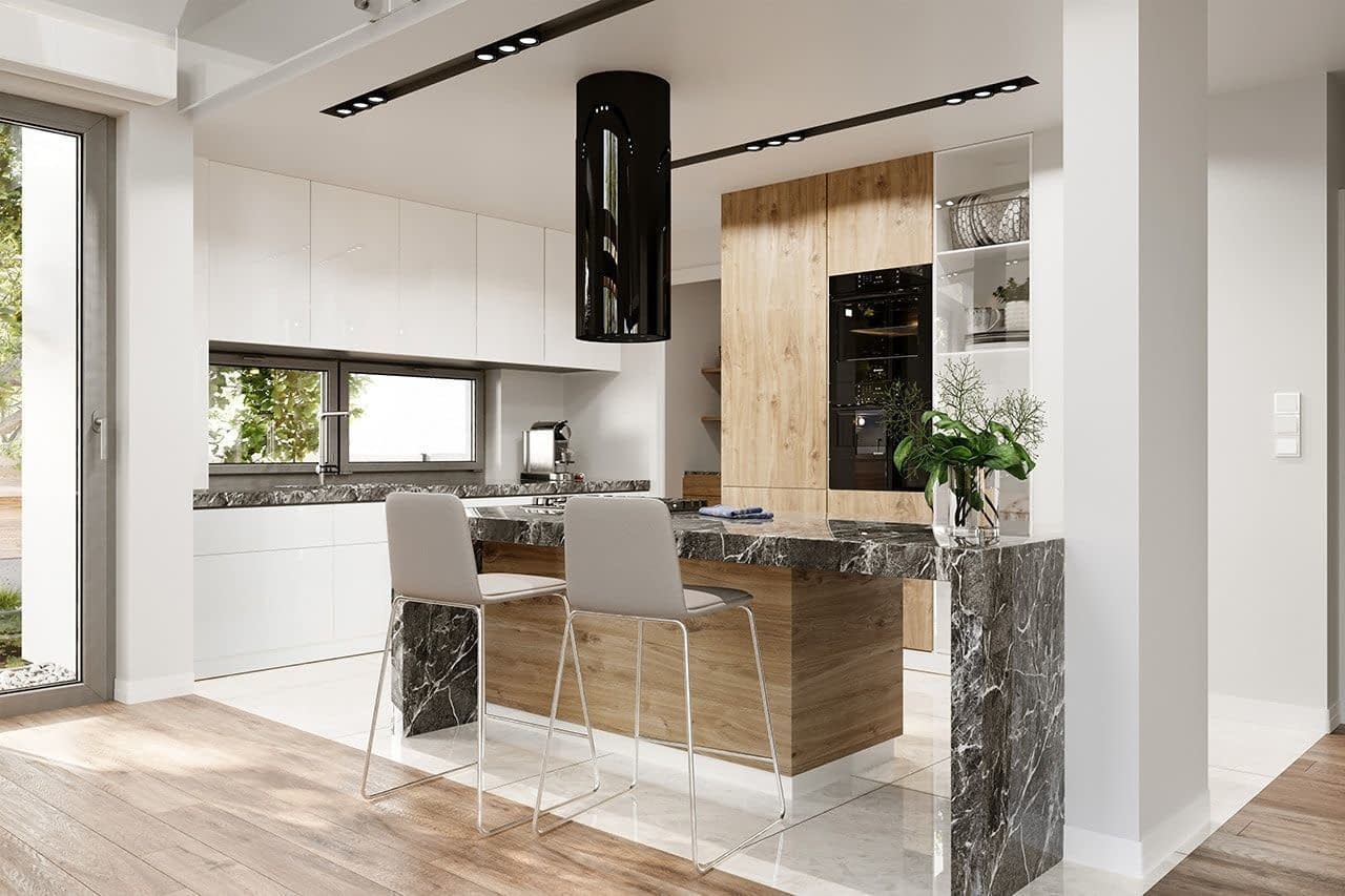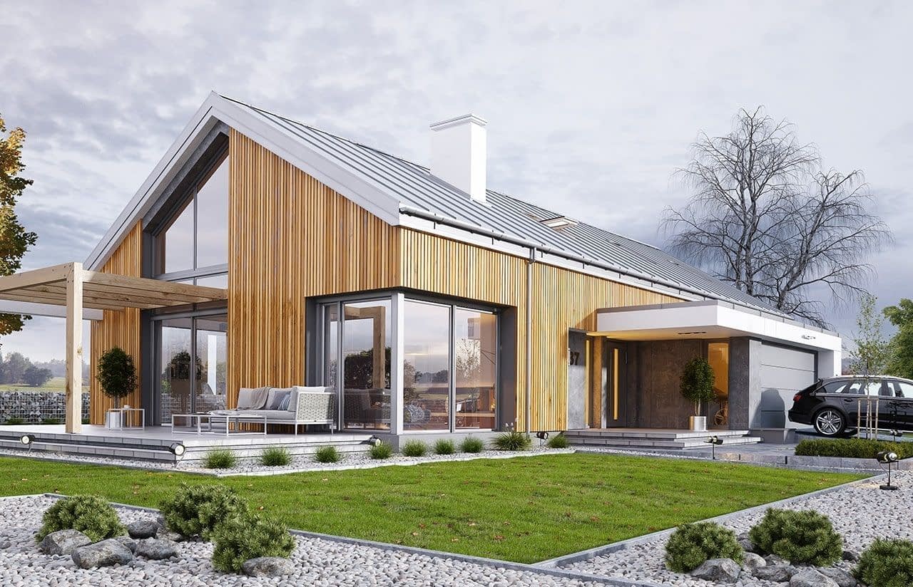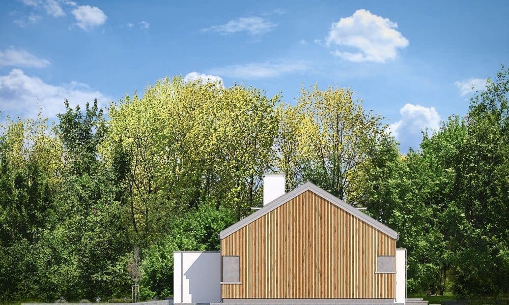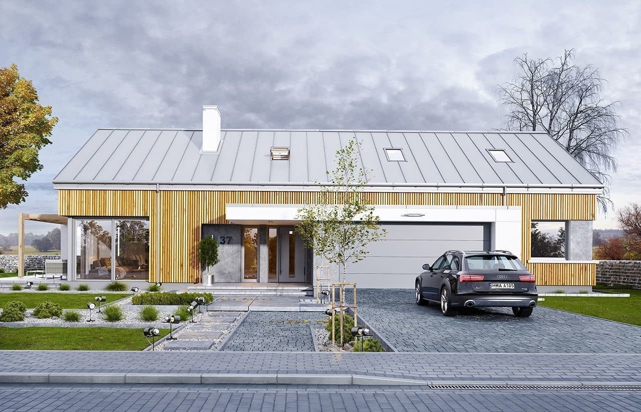 Projekt domu Wymarzony 4 jest kolejną propozycją z serii domów „Wymarzonych” - budynek parterowy z poddaszem do zagospodarowania, zbudowany na planie prostokąta, z wystającą na froncie częścią garażową, przykryty dwuspadowym dachem o kącie nachylenia 35 stopni. Projekt domu Wymarzony 4 jest utrzymany w nowoczesnej stylistyce domu-stodoły, coraz częściej wybieranej przez Inwestorów. Dach budynku nie ma okapów, pokrycie dachowe zaprojektowano z blachy na rąbek stojący, a ściany zewnętrzne wykończono pionową okładziną z drewnianej kantówki. Takie zestawienie materiałów, połączone z powierzchniami z płyt imitujących beton, oraz szarą stolarką okienną tworzy bardzo atrakcyjny wygląd budynku. Głównymi detalami stylistycznymi są : wystający garaż, podcień wejściowy i reprezentacyjne drzwi frontowe z naświetlami. W szczycie domu z kolei dwukondygnacyjne okno salonu i taras częściowo przykryty pergolą. Dzięki lokalizacji tarasu z boku budynku dom nadaje się doskonale nawet na działkę z wjazdem od południa. Salon w „Wymarzonym 4” jest oświetlony z trzech stron, zatem budynek można lokalizować na działce z ogródkiem z boku albo z tyłu, a nawet od frontu domu, w narożniku działki. Wnętrze : oryginalna lokalizacja garażu, w centralnej części bryły, ułatwia komunikację między garażem, przedsionkiem i kotłownią, co jest rzadko spotykane w domach parterowych o prostokątnym kształcie. Garaż jest w idealnym miejscu - przy wejściu, blisko holu i kuchni . Kotłownia obok salonu i kominka sprawia, że mamy jeden wspólny komin w całym budynku. Z przedsionka wchodzimy do holu i części dziennej połączonych pomieszczeń salonu jadalni i kuchni. Kuchnia jest oddzielona od jadalni półwyspem z barkiem. Z kuchni mamy dostęp do spiżarni, pralni i wyjścia gospodarczego na tył domu. Salon doświetlony jest z każdej strony, a otwarcie sufitu nad salonem powiększa jego wysokość tworząc atrakcyjną przestrzeń z antresolą na poddaszu. Z drugiej strony domu mamy trzy sypialnie, łazienkę i garderobę. Nad parterem zaprojektowano poddasze, z antresolą nad salonem powiększającą jego przestrzeń i z dodatkową powierzchnią poddasza, która może pozostać strychem nieużytkowym (magazynem domowym), lub może być zagospodarowana na pokoje użytkowe - według życzenia i potrzeb właścicieli. Projekt domu Wymarzony 4 to komfortowa, wygodna i nowoczesna willa dla cztero- sześcioosobowej rodziny - funkcjonalna i praktyczna. Budynek jest energooszczędny, ma prostą konstrukcję, będzie łatwy w budowie i tani w utrzymaniu. Zapraszamy do zapoznania się z pełną ofertą pracowni MG Projekt tej serii: Wymarzony, Wymarzony 2, Wymarzony 3, Wymarzony 5, Wymarzony 6, Wymarzony 7, Wymarzony 8, Wymarzony 9, Wymarzony 10, Wymarzony 11.