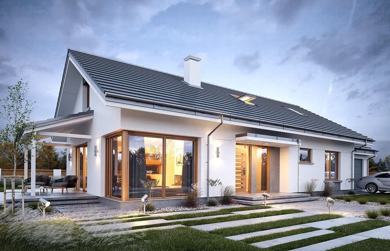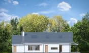 Projekt domu Wymarzony 7 kolejny z serii domów „Wymarzonych” z naszej pracowni. Budynek zaprojektowano jako parterowy ze strychem –poddaszem do dowolnego zagospodarowania. Prostokątną bryłę z dobudowanym garażem przekryto dwoma dachami dwuspadowymi o kącie nachylenia 30 stopni. Projekt domu Wymarzony 7 ma nowoczesną stylistykę i łączy tradycyjną bryłę z klasycznym dachem, z nowoczesnymi materiałami wykończeniowymi i detalami. Połączenie białych tynkowanych ścian z okładzinami imitującymi beton, szarą lub grafitową dachówką, oraz drewnianymi ramami okien, dają elegancki i reprezentacyjny wygląd budynku. Głównymi detalami stylistycznymi projektu są : strefa wejściowa, z daszkiem i ładnymi drzwiami wejściowymi, narożne okna salonu, zadaszony częściowo taras ogrodowy. Dom zaprojektowano w taki sposób, aby salon miał doświetlenie z trzech stron budynku, co pozwala lokalizować projekt na niekorzystnych działkach - z wjazdem od południa, czy z ogrodem z boku, albo nawet przed domem (w narożniku). Wnętrze: Projektując wnętrze staraliśmy się sprostać zasadniczemu zadaniu - zaaranżować wygodne wnętrze z salonem i czterema pokojami, oraz wszystkimi potrzebnymi pomieszczeniami dodatkowymi. Do domu wchodzimy wygodnym przedsionkiem wprost do części dziennej, z salonem, jadalnią, częściowo zamkniętą półwyspem kuchnią. Kuchnia połączona jest ze spiżarką, oraz pralnią z wyjściem gospodarczym na tył domu. Z drugiej strony domu mamy trzy sypialnie, w tym sypialnię rodziców z garderoba, łazienkę i dodatkowy pokój – gabinet lub extra sypialnię. Przez podwójne drzwi i dodatkowy korytarz dom łączy się z garażem i kotłownią. Nad parterem zaprojektowano strych - poddasze, które może pozostać strychem nieużytkowym (magazynem domowym), lub może być zagospodarowane na pokoje użytkowe - według życzenia i potrzeb właścicieli. Projekt domu Wymarzony 7 to komfortowy, wygodny dom dla cztero- pięcioosobowej rodziny - funkcjonalny i praktyczny. Budynek jest energooszczędny, ma prostą konstrukcję, będzie łatwy w budowie i tani w utrzymaniu. Zapraszamy do zapoznania się z pełną ofertą pracowni MG Projekt tej serii: Wymarzony, Wymarzony 2, Wymarzony 3, Wymarzony 4, Wymarzony 5, Wymarzony 6, Wymarzony 8, Wymarzony 9, Wymarzony 10, Wymarzony 11.
