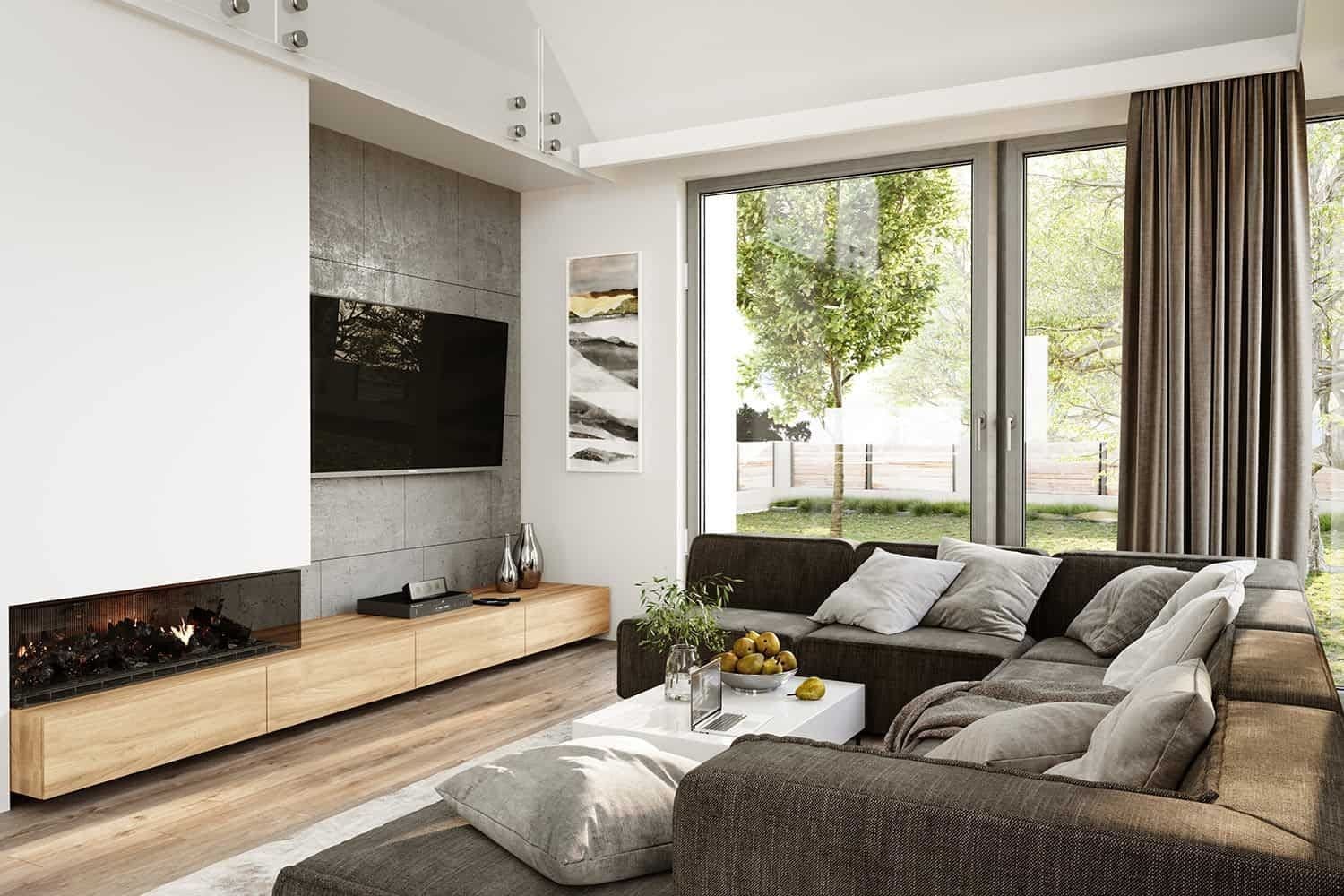 Projekt domu Wymarzony 8 to kolejny dom z serii projektów „Wymarzonych” z naszej pracowni. Budynek został zaprojektowany w modnej stylistyce „domu-stodoły”. Dom jest parterowy z poddaszem. Przykryty został dwuspadowym dachem o kącie nachylenia 35 stopni. Dach nie ma okapów, bryła jest maksymalnie prosta, nowoczesna, z dostawionymi od frontu i tyłu pudełkowymi zadaszeniami kryjącymi wejście i wykusz kuchni. W projekcie zastosowano ciekawe detale i materiały uatrakcyjniające wygląd zewnętrzny. Połączenie dachu krytego blachą na rąbek stojący, białych ścian, szarych okładzin i drewnianych ram stolarki okiennej dają świetny efekt wizualny. Dom Wymarzony 8 jest nowoczesny, prosty, a zarazem elegancki i reprezentacyjny. Głównym detalem wyróżniającym elewację frontową jest część wejściowa, z podestem, ciekawym pudełkowym zadaszeniem i drzwiami wejściowymi z naświetlami. Od strony elewacji tylnej zabieg ten powtórzono w wykuszu kuchni. Niewątpliwie najciekawszy jest szczyt domu z oknem biegnącym przez całą wysokość elewacji, które doświetla salon z pustką i antresolą, otwierając wnętrze na taras z pergolą i ogród. Dom zaprojektowano w taki sposób, aby salon miał doświetlenie z trzech stron budynku, co pozwala lokalizować go na niekorzystnej działce - z wjazdem od południa, czy z ogrodem z boku. Projektując wnętrze staraliśmy się sprostać zasadniczemu zadaniu - zmieścić wygodne cztery pokoje + salon, oraz wszystkie potrzebne pomieszczenia dodatkowe. Do domu wchodzimy wygodnym przedsionkiem wprost do części dziennej, z salonem, jadalnią i częściowo zamkniętą półwyspem kuchnią. Kuchnia połączona jest ze spiżarką, oraz pralnią z wyjściem gospodarczym na tył domu. Z drugiej strony domu mamy trzy sypialnie, w tym sypialnię rodziców z garderoba, łazienkę i dodatkowy pokój – gabinet lub extra sypialnię. Przez podwójne drzwi i dodatkowy korytarz dom łączy się z garażem i kotłownią. Nad parterem zaprojektowano poddasze, składające się z pustki nad salonem, następnie antresoli ze schodami będącej przedłużeniem salonu na dole, oraz z dodatkowej przestrzeni strychu-poddasza, którą można pozostawić jako strych (magazyn), albo zamienić na dodatkowe pokoje użytkowe - wedle życzenia właściciela. Projekt domu Wymarzony 8 to komfortowy, wygodny dom o nowoczesnej i atrakcyjnej architekturze, przeznaczony dla cztero- pięcioosobowej rodziny. Budynek jest energooszczędny, ma prostą konstrukcję, będzie łatwy w budowie i tani w utrzymaniu. Zapraszamy do zapoznania się z pełną ofertą pracowni MG Projekt tej serii: Wymarzony, Wymarzony 2, Wymarzony 3, Wymarzony 4, Wymarzony 5, Wymarzony 6, Wymarzony 7, Wymarzony 9, Wymarzony 10, Wymarzony 11.
