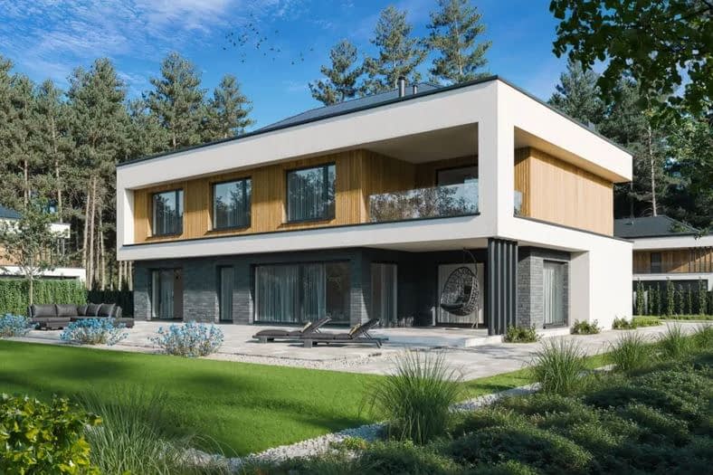 Całość uzupełnia taras i harmoniczne powiązanie wnętrza z ogrodem, co czyni dom idealnym rozwiązaniem dla osób ceniących nowoczesną architekturę, przestrzeń i komfort życia.