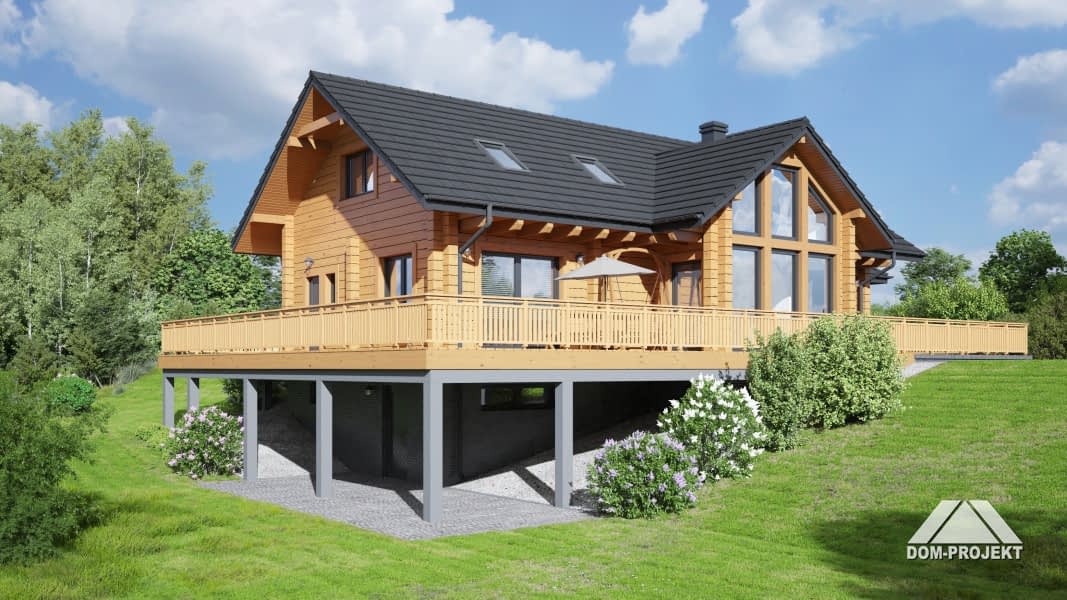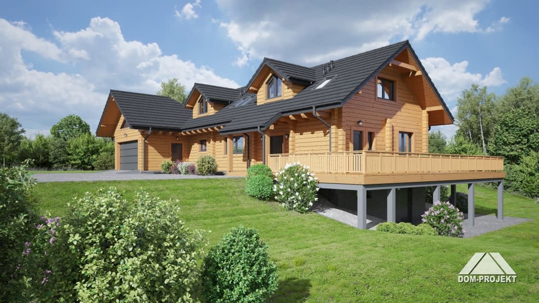 Dom z bali. Częściowo podpiwniczony. Duży salon z aneksem kuchennym, kominkiem i wyjściem na taras. Dwa pokoje, łazienka, sauna, wc, wiatrołap, kotłownia, komunikacja, korytarz i garaż. Na poddaszu dwa pokoje, garderoba, łazienka, komunikacja i antresola. W części podpiwniczonej: trzy piwnice, komunikacja i schody na parter.Rzuty