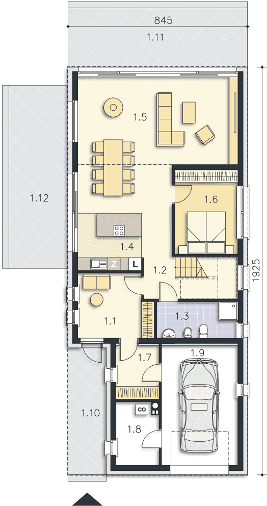 Efektowny dom z poddaszem użytkowym i dwuspadowym bezokapowym dachem w stylu nowoczesnej stodoły, idealny do zabudowy na wąską działkę. Wejście i wjazd do garażu są po tej samej, wschodniej, stronie. Sercem projektu jest strefa dzienna, czyli otwarta przestrzeń, na którą składa się salon, kuchnia i jadalnia. Duże przeszklenia na południe i zachód sprawiają, że światło słoneczne wpada tam przez cały dzień. Podwyższony sufit w salonie czyni ten jasny pokój jeszcze bardziej przestronnym. Komin z przezroczystym paleniskiem doskonale go zdobi, szczególnie wieczorami, gdy słońce już zajdzie. Obok znajdziemy dodatkowy pokój gościnny, lub biuro. Sypialnie domowników znajdują się na poddaszu , wraz z wspólną łazienką i pomieszczeniem gospodarczym. Dwie są takie same, z oknami na wschód, szczególnie miłymi o porankach. Trzecia, której lukarna daje nieziemskie przeszklenie, jest połączona z łazienką i garderobą - własny apartament dla rodziców. W projekcie przewidziano ogrzewanie kotłem na gaz. Możliwa jest zmiana ogrzewania na pompę ciepła.