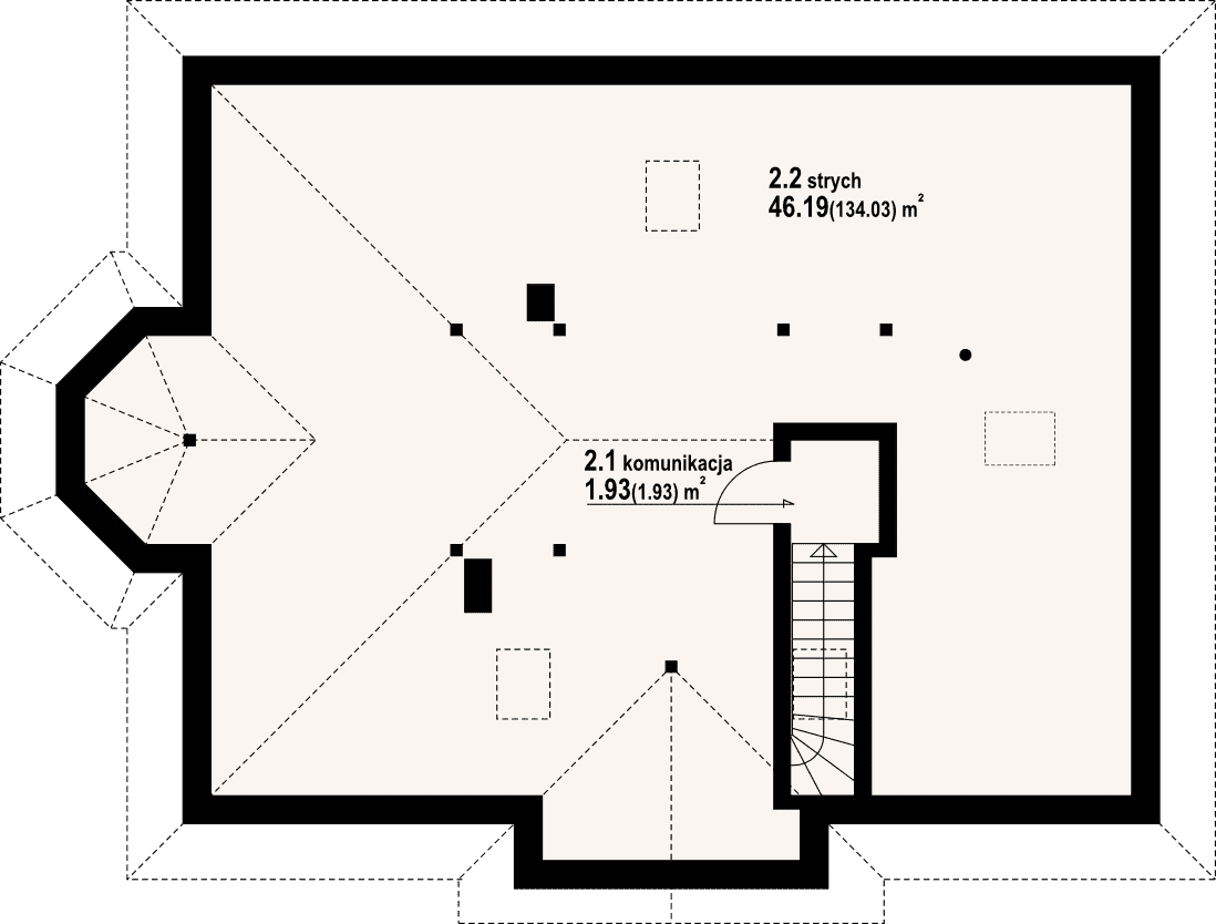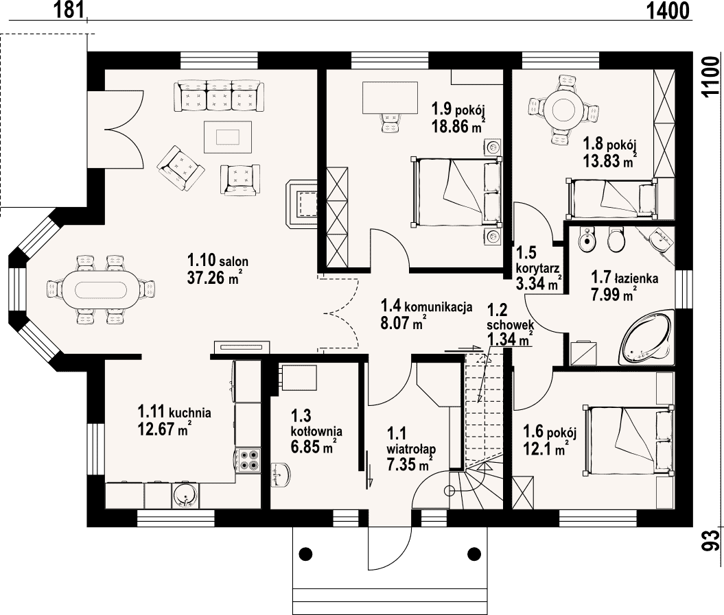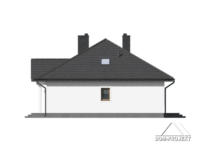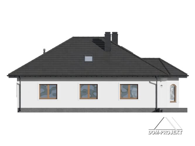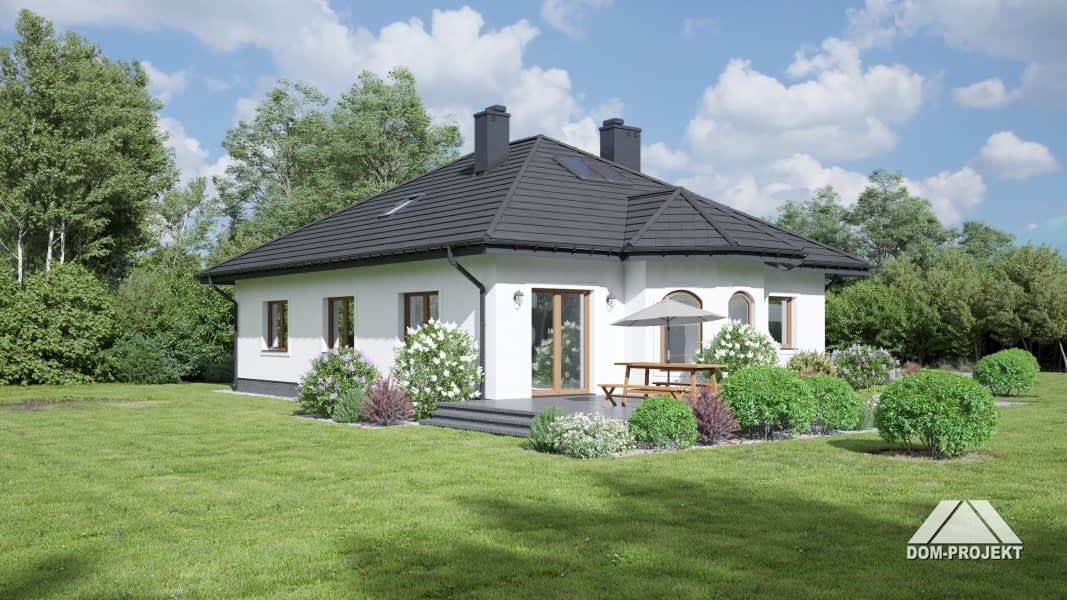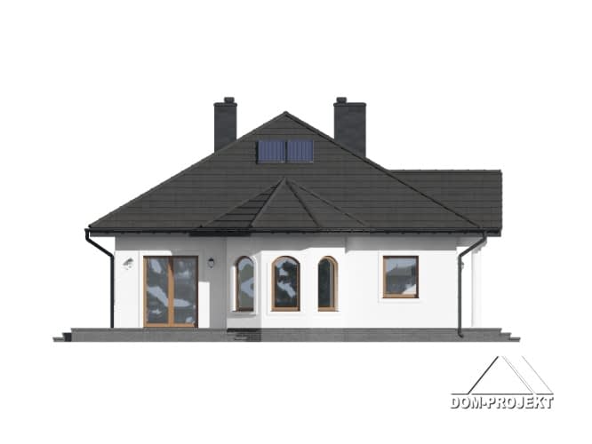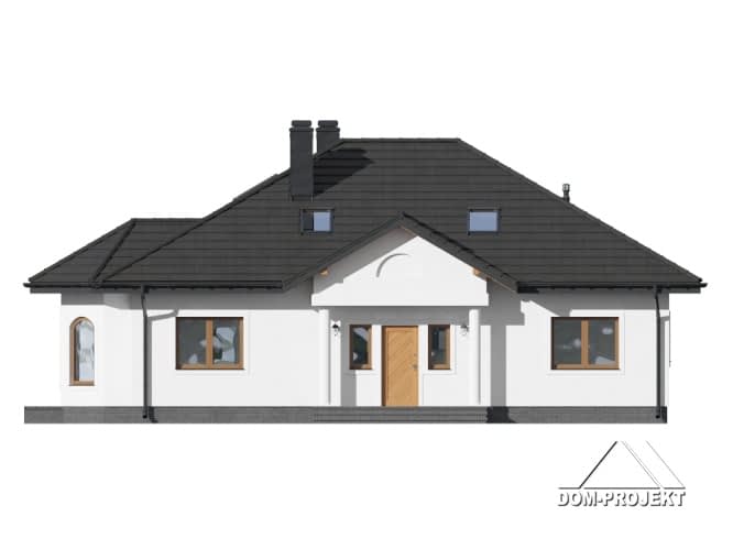Parterowy dom o pięknej, klasycznej architekturze. Cztery pokoje, łazienka, kuchnia, kotłownia. Duży salon z kominkiem, wyjściem na taras i do ogrodu, połączony jest z kuchnią. Na parterze ponadto: trzy pokoje, duża łazienka oraz wyodrębniona kotłownia. Schody na strych z wiatrołapu. Ozdobą elewacji jest wykusz, który jest miejscem na jadalnię. Na dachu dużo miejsca do zamontowania baterii słonecznych. Liczne wersje projektu.Rzuty