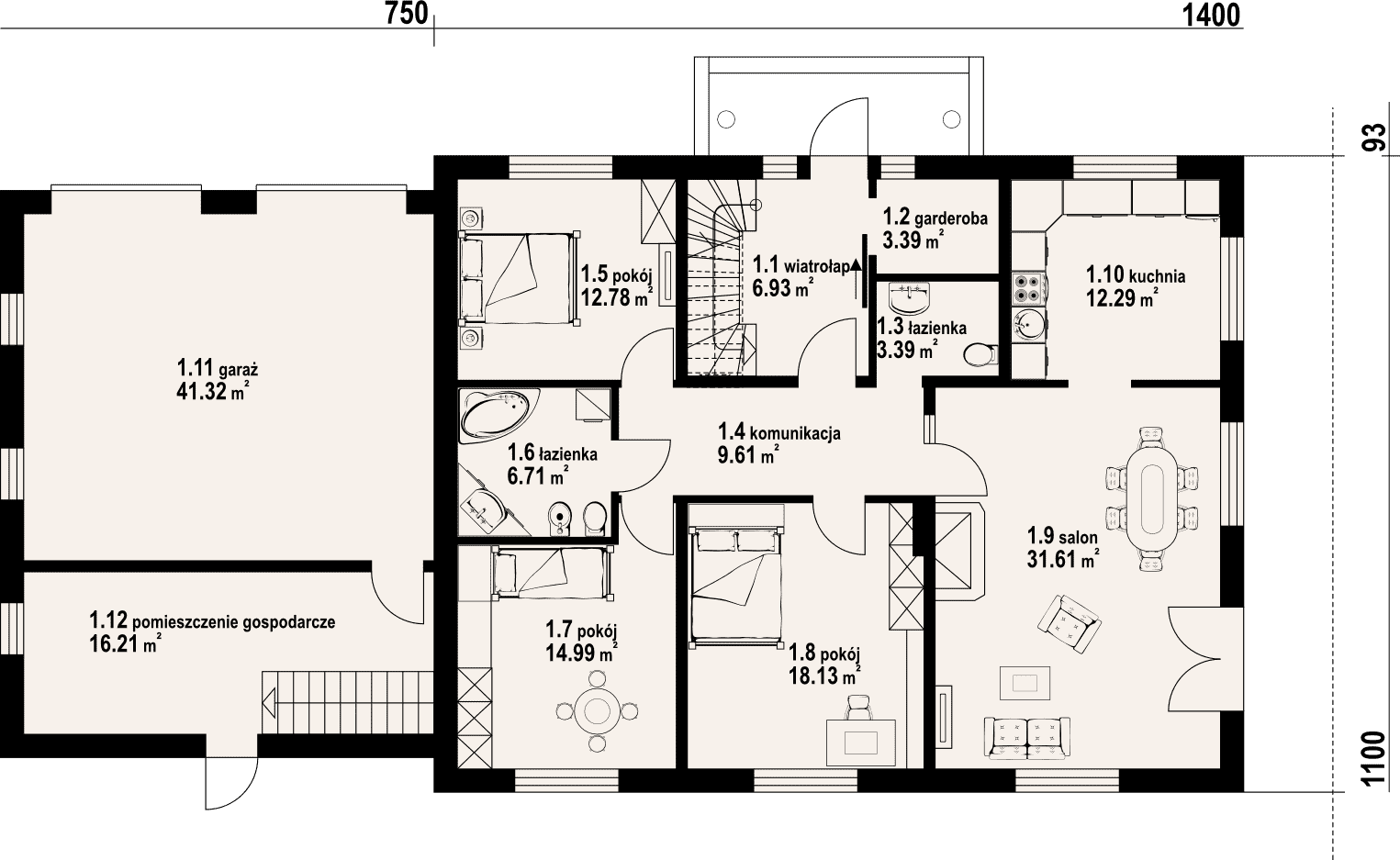 Obszerny w pełni podpiwniczony dom z poddaszem użytkowym. Na parterze salon, wydzielona kuchnia, a także trzy pokoje. Poddasze to dwie sypialnie, dwie garderoby, łazienka oraz strych. Do domu przybudowano dwustanowiskowy garaż z usytuowaną na jego przedłużeniu kotłownią. Piwnica stanowi zaplecze gospodarcze domu.Rzuty