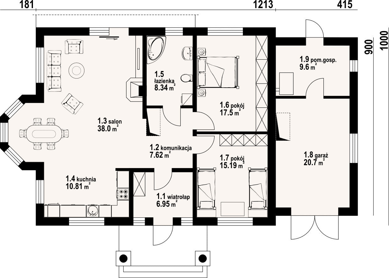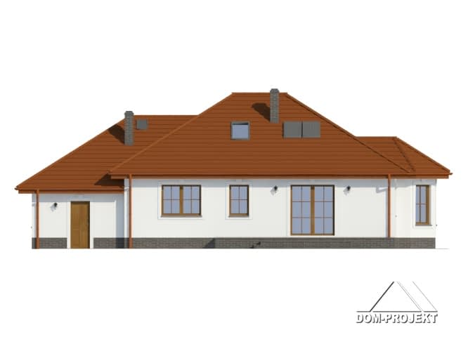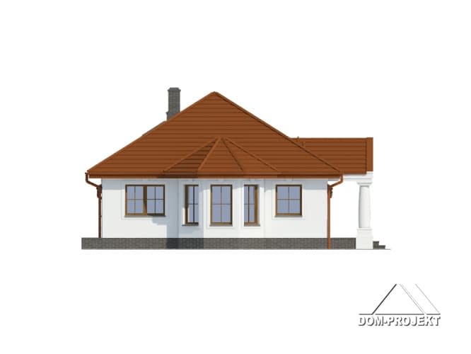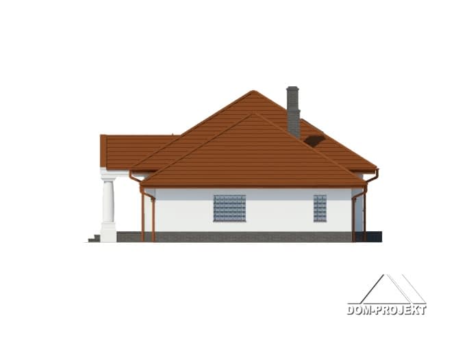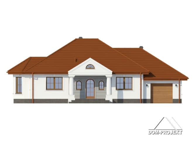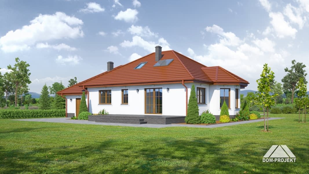 Wygodny dom parterowy. Duży salon z aneksem kuchennym, kominkiem i wyjściem na taras. Dwa pokoje, łazienka, wiatrołap, komunikacja. W bocznej części garaż i pomieszczenie gospodarcze. W garażu schody rozkładane na strych.Rzuty