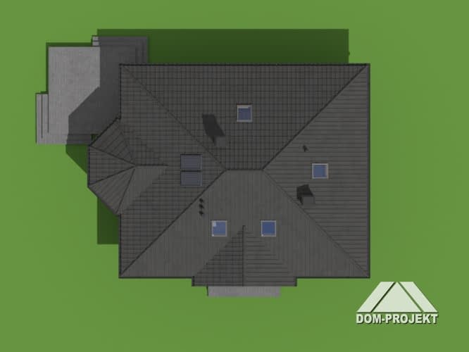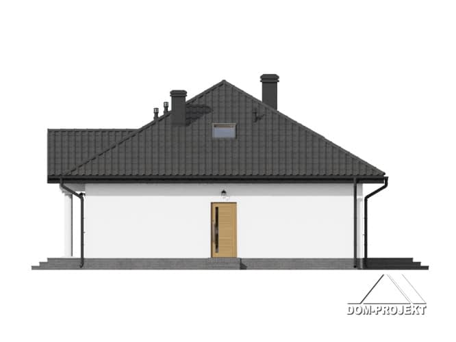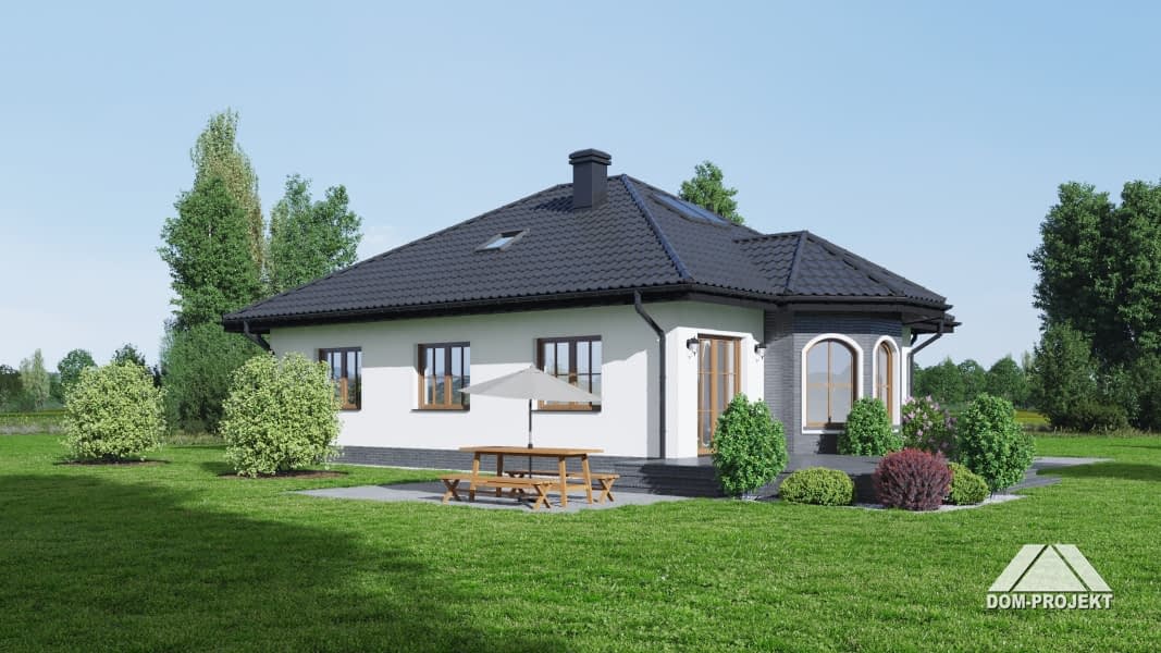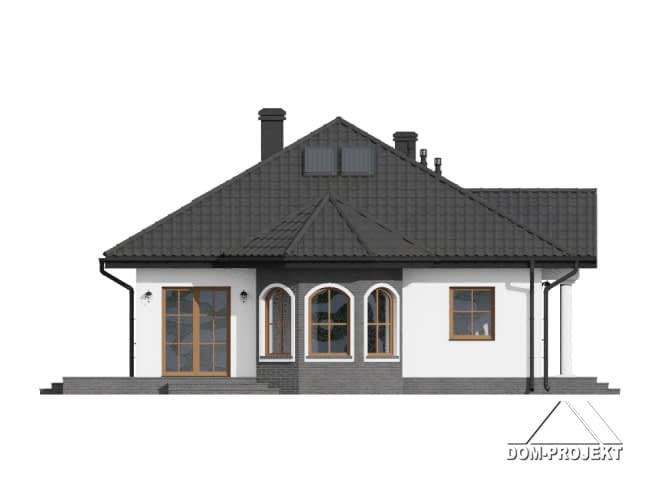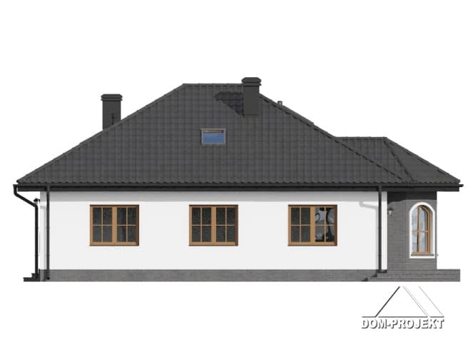 Funkcjonalny dom parterowy. Podstawowym pomieszczeniem domu jest przestronny salon, oprócz salonu trzy pokoje sypialne różnej wielkości, wydzielona kuchnia, łazienka i kotłownia. W salonie ozdobny wykusz. Schody na strych prowadzą z wiatrołapu.Rzuty