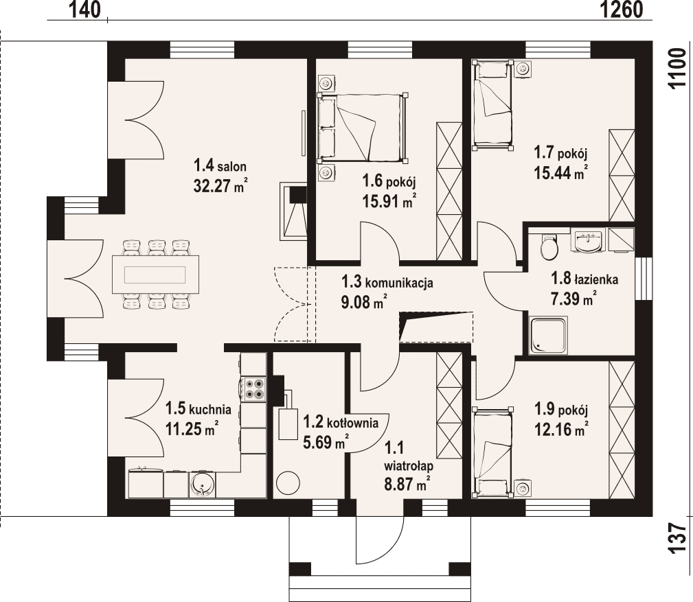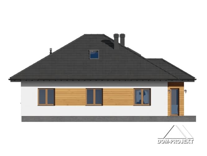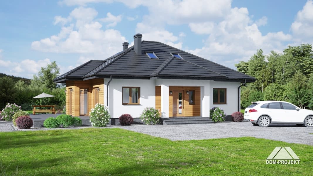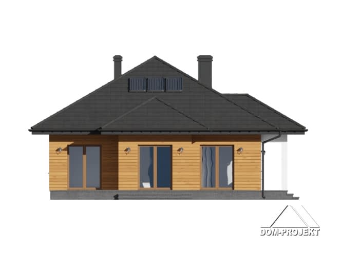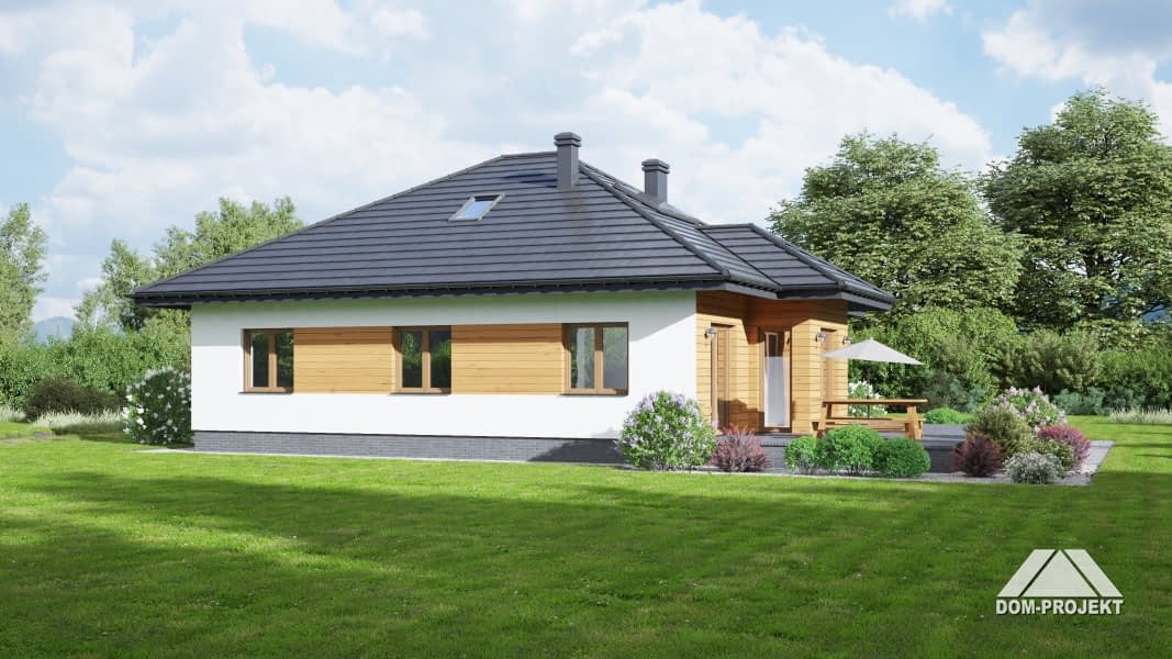 Dom parterowy. Salon z kominkiem, wyjściem na taras oraz przejściem do kuchni. Trzy pokoje, łazienka, komunikacja, wiatrołap oraz kotłownia. Zwarta bryła budynku sprzyja szybkiej i taniej budowie oraz niskim kosztom eksploatacji.Rzuty