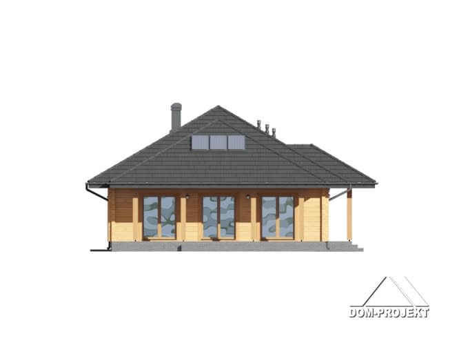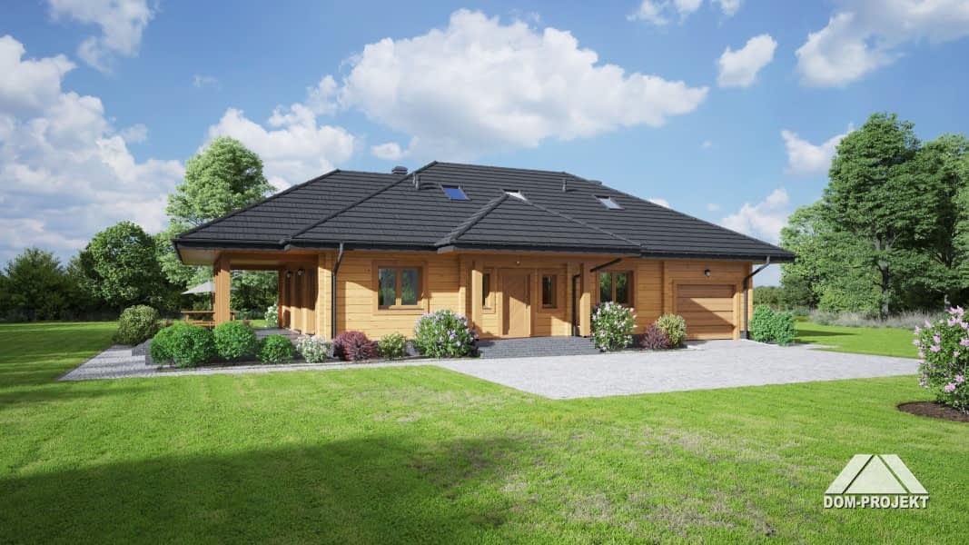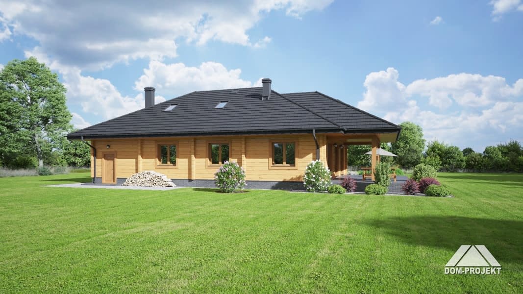 Dom z bali drewnianych. Parterowy. Duży salon z kominkiem i wyjściem na zadaszony taras. Kuchnia, trzy pokoje, łazienka, komunikacja, wiatrołap, spiżarka, Garaż i kotłownia. Wejście na poddasze nieużytkowe schodami strychowymi rozkładanymi.Rzuty