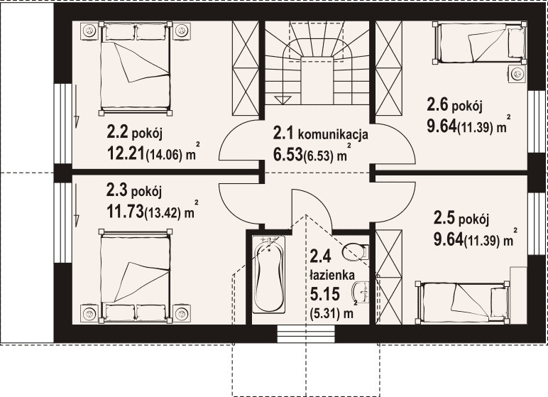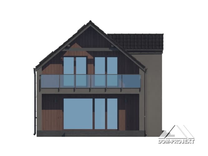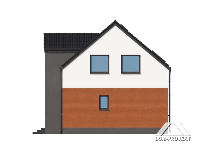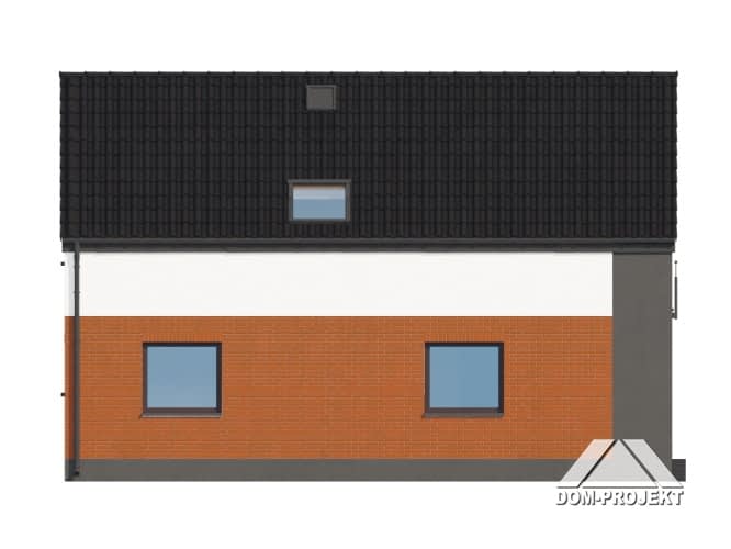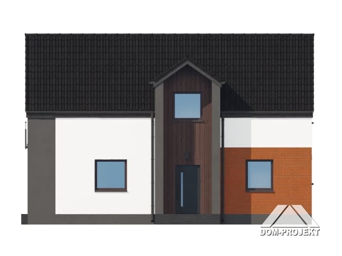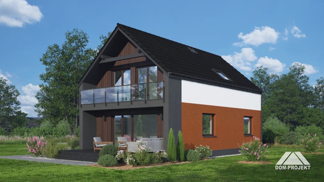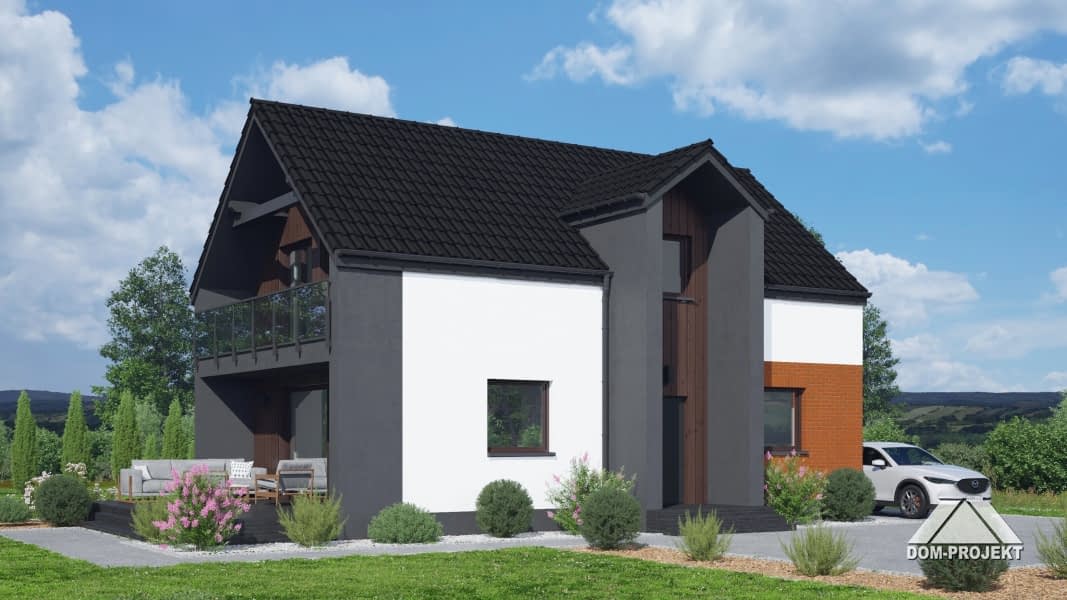 Dom z poddaszem użytkowym. Na parterze salon z aneksem kuchennym, wyjściem na taras i schodami na poddasze. Pokój do pracy, komunikacja, łazienka, pomieszczenie gospodarcze, komunikacja, wiatrołap. Na poddaszu cztery pokoje, łazienka, komunikacja oraz balkon dostępny z dwóch pokoi. Zwarta bryła budynku oraz dach dwuspadowy sprzyjają szybkiej i taniej budowie oraz niskim kosztom eksploatacji.Rzuty