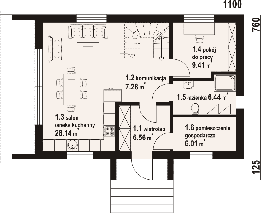 - 1.3 - salon z aneksem kuchennym28.14 m²