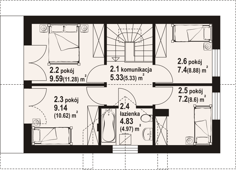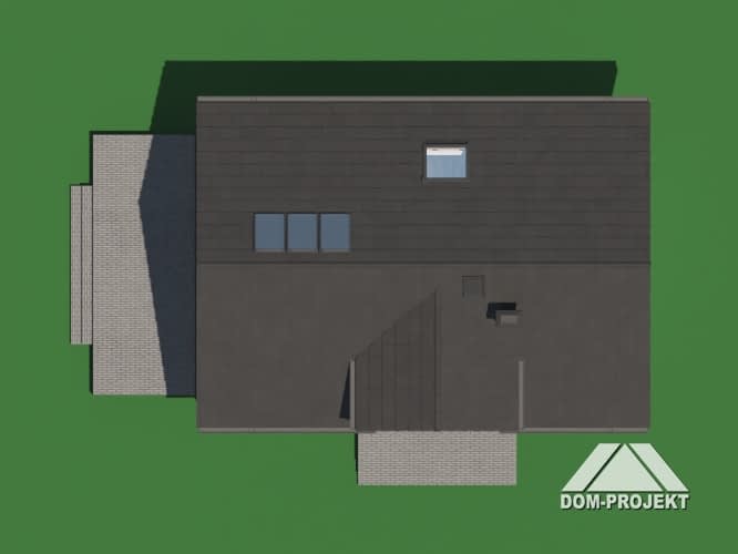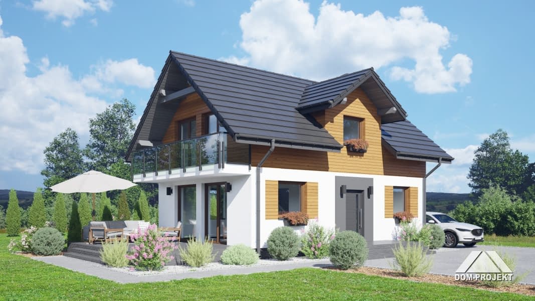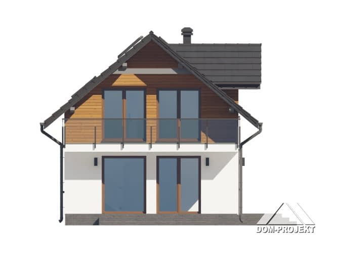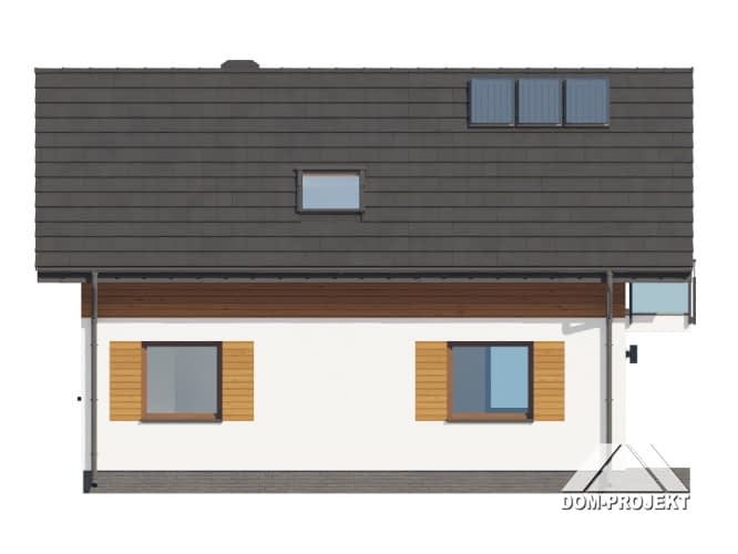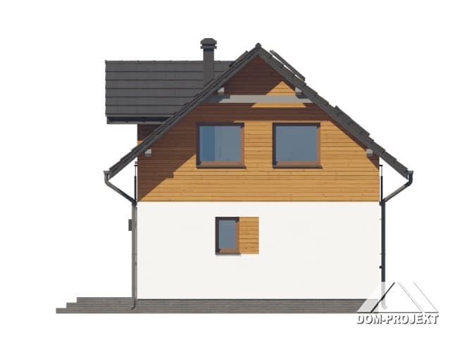 Mały dom z poddaszem użytkowym. Na parterze salon z aneksem kuchennym, wyjściem na taras i schodami na poddasze. Pokój do pracy, łazienka, wiatrołap. Na poddaszu cztery pokoje, łazienka, komunikacja. Zwarta bryła budynku oraz dach dwuspadowy sprzyjają szybkiej i taniej budowie oraz niskim kosztom eksploatacji.Rzuty