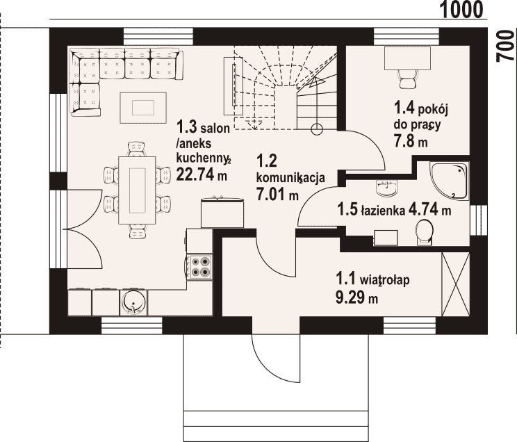 - 1.3 - salon z aneksem kuchennym22.74 m²