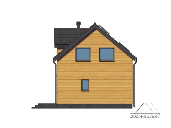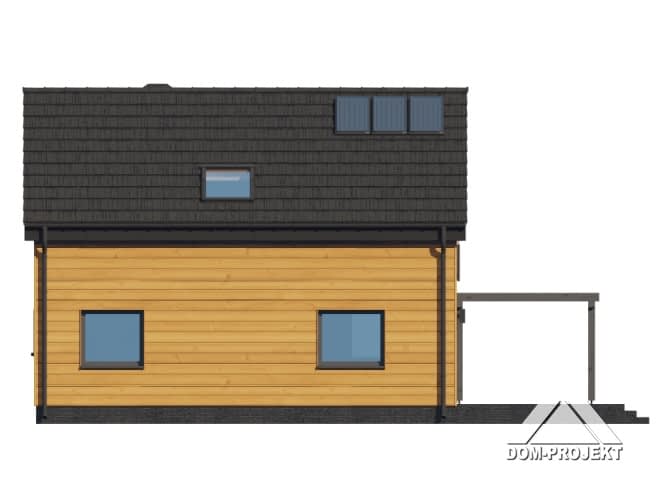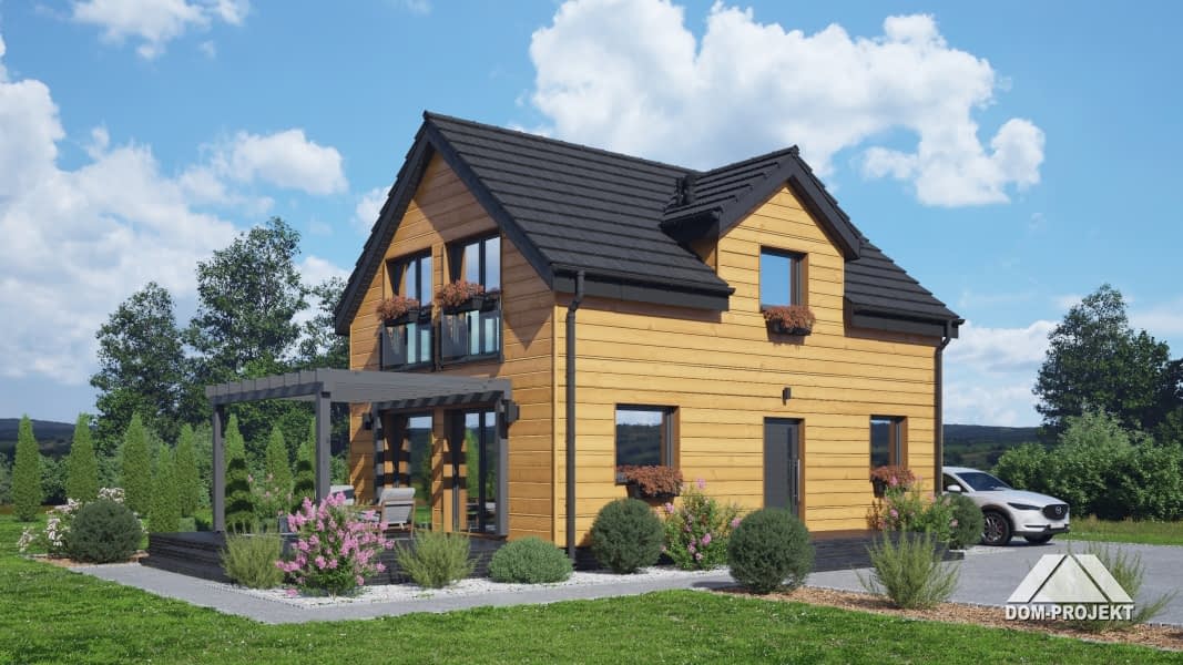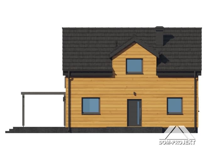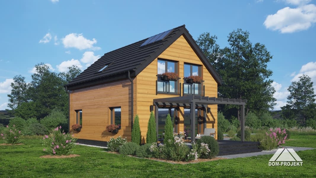 Dom w konstrukcji szkieletu drewnianego. Na parterze salon z aneksem kuchennym, wyjściem na taras i schodami na poddasze. Pokój, łazienka, komunikacja, wiatrołap. Na poddaszu cztery pokoje, łazienka, komunikacja. Zwarta bryła budynku oraz dach dwuspadowy sprzyjają szybkiej i taniej budowie oraz niskim kosztom eksploatacji.Rzuty