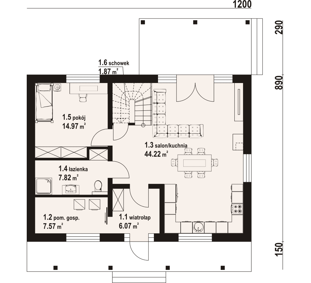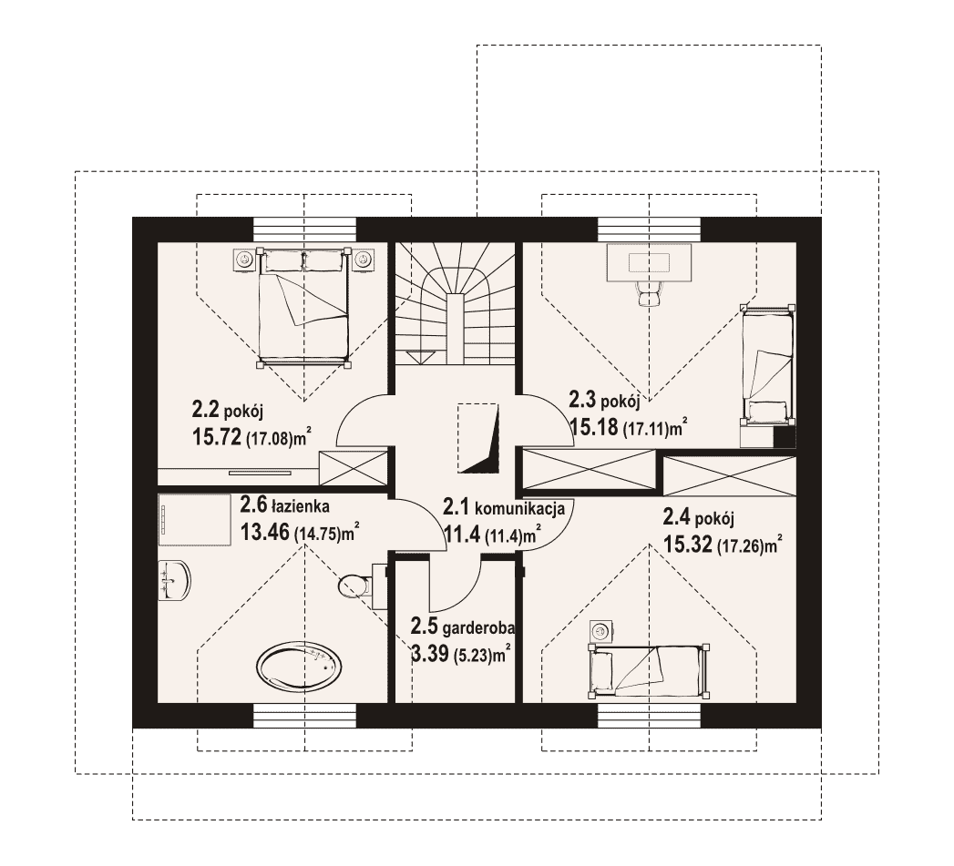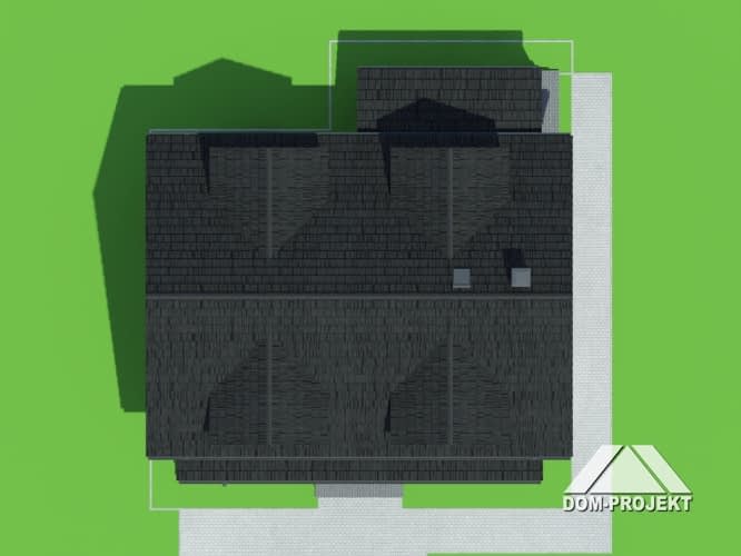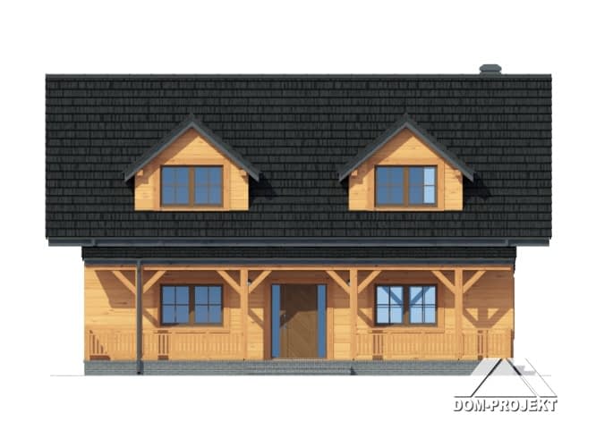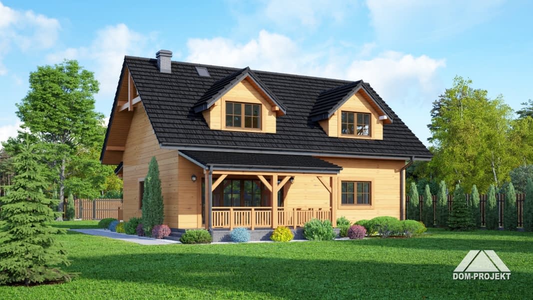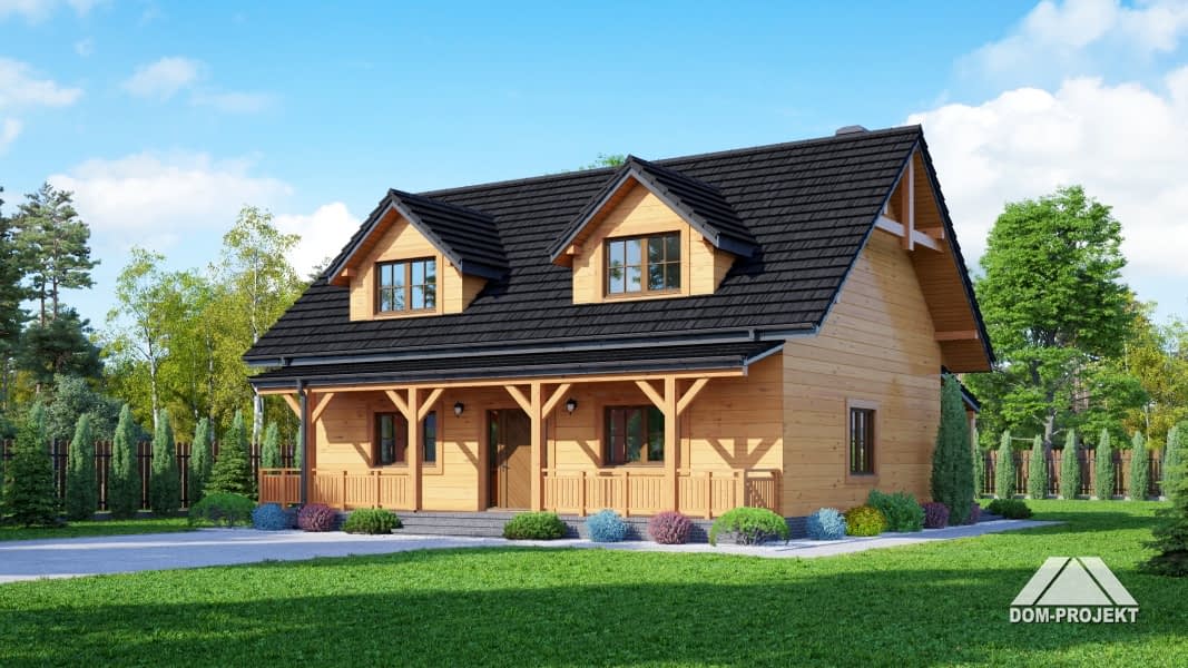 Dom murowany wykończony z zewnątrz drewnem. Duży salon z aneksem kuchennym ,wyjściem na zadaszony taras i schodami na poddasze. Pokój, łazienka, wiatrołap i pomieszczenie gospodarcze. Na poddaszu trzy pokoje, łazienka i garderoba. Zwarta bryła budynku i dach dwuspadowy sprzyjają szybkiej i taniej budowie i niskim kosztom eksploatacji.Rzuty