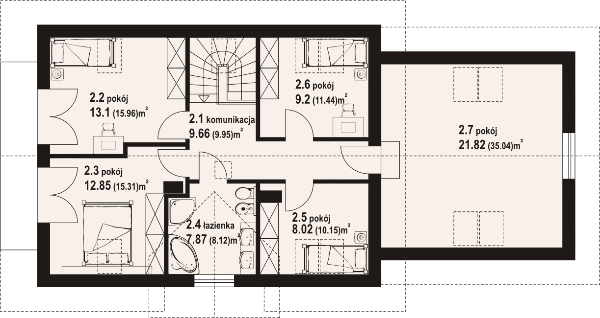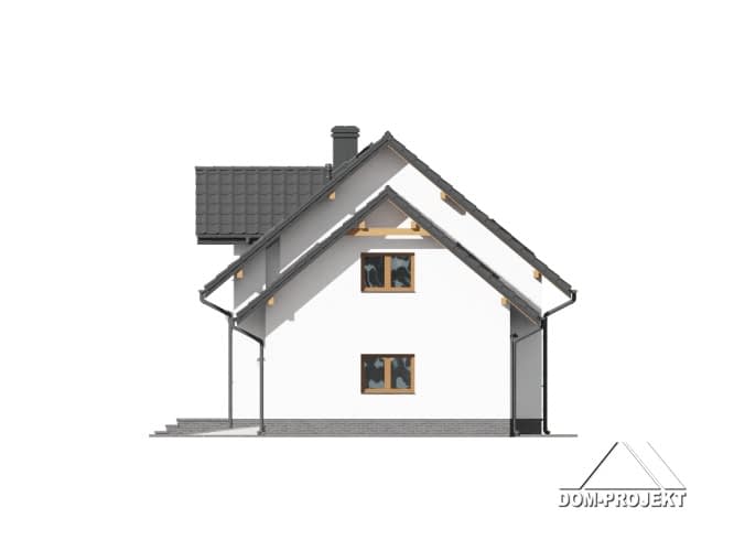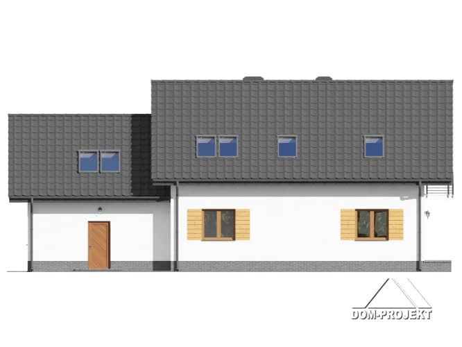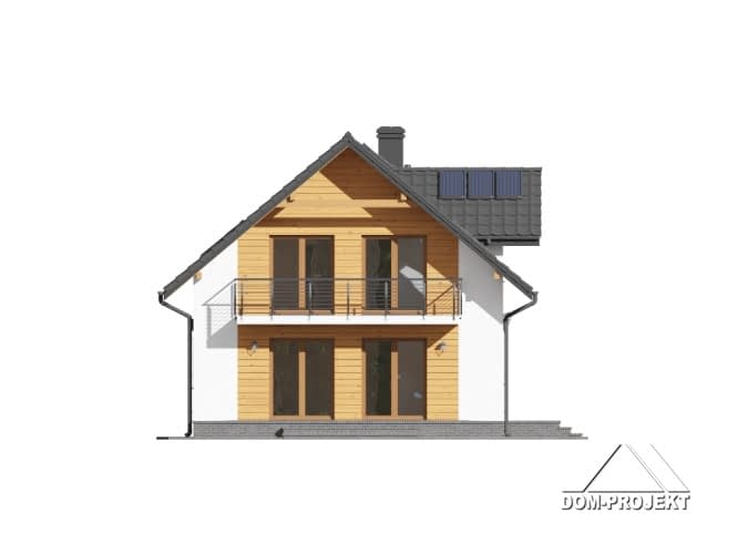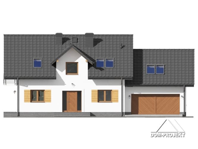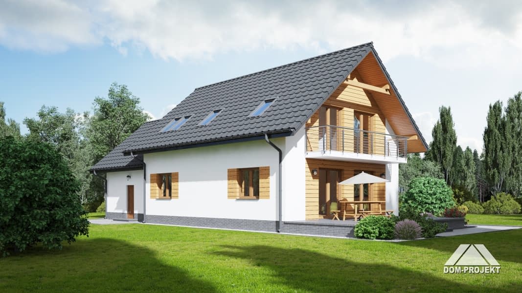 Dom z poddaszem. Duży salon z aneksem kuchennym, kominkiem i wyjściami na taras. Pokój, łazienka, wiatrołap, kotłownia i garaż na dwa samochody. Na poddaszu pięć pokoi, łazienka, komunikacja i balkon. Zwarta bryła budynku i dach dwuspadowy sprzyjają szybkiej i taniej budowie i niskim kosztom eksploatacji.Rzuty