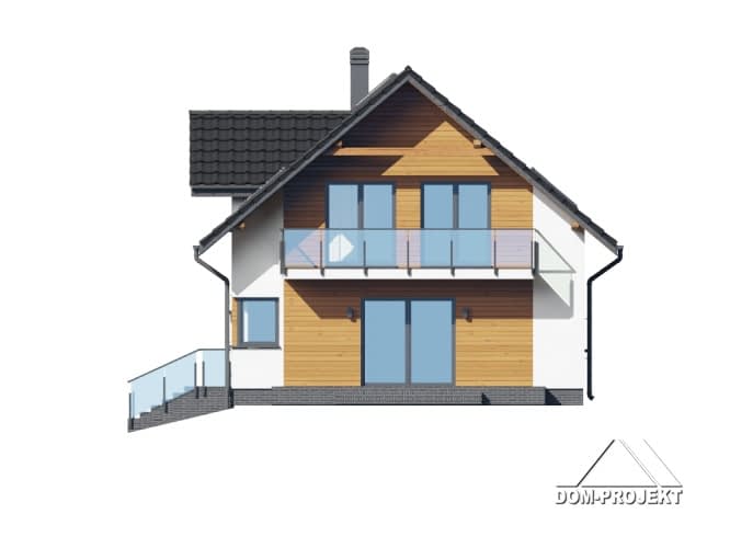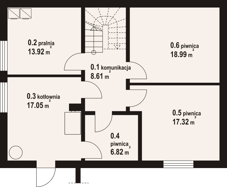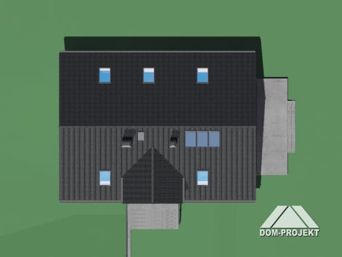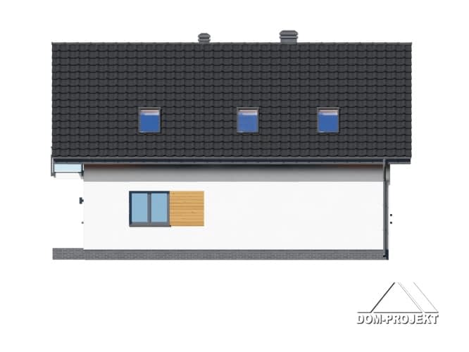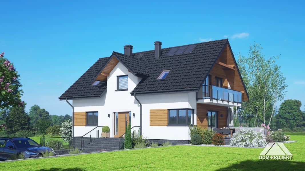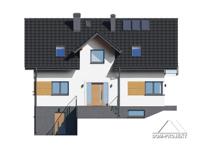 Dom z poddaszem użytkowym. Podpiwniczony. Na parterze salon z aneksem kuchennym, wyjściem na taras i schodami na poddasze. Dwa pokoje, wiatrołap, łazienka. Na poddaszu cztery pokoje, łazienka, komunikacja, garderoba oraz balkon dostępny z dwóch pokoi. W podpiwniczeniu komunikacja, trzy piwnice, pralnia i kotłownia. Zwarta bryła budynku oraz dach dwuspadowy sprzyjają szybkiej i taniej budowie oraz niskim kosztom eksploatacji.Rzuty