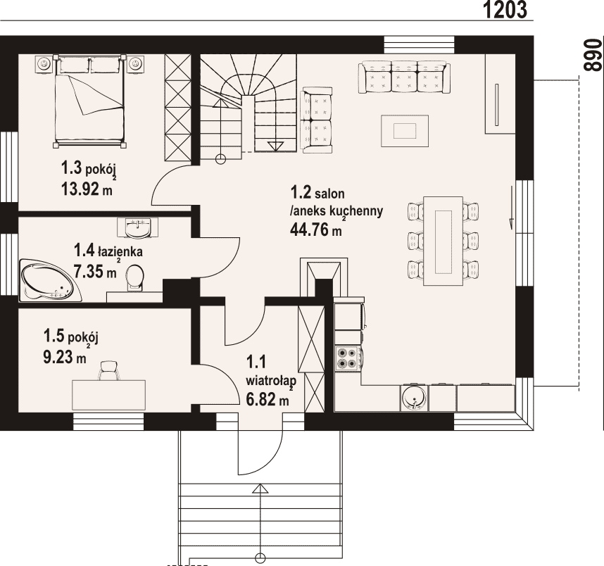 - 1.2 - salon z aneksem kuchennym44.76 m²
