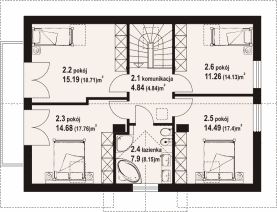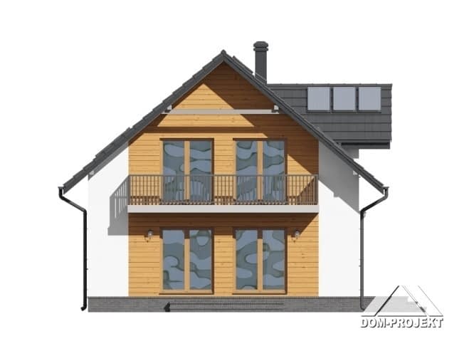 Dom z poddaszem. Duży salon z aneksem kuchennym, kominkiem, schodami na poddasze i wyjściami na taras. Pokój, łazienka, wiatrołap i kotłownia. Na poddaszu cztery pokoje, łazienka, komunikacja i balkon. Zwarta bryła budynku i dach dwuspadowy sprzyjają szybkiej i taniej budowie i niskim kosztom eksploatacji.Rzuty
