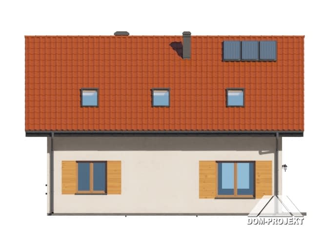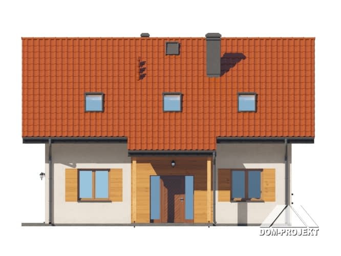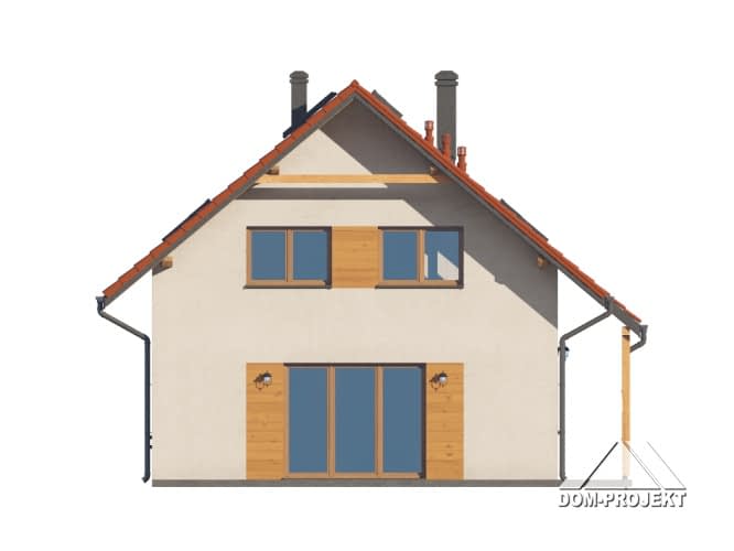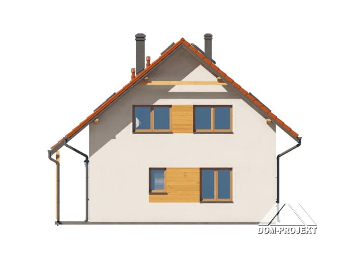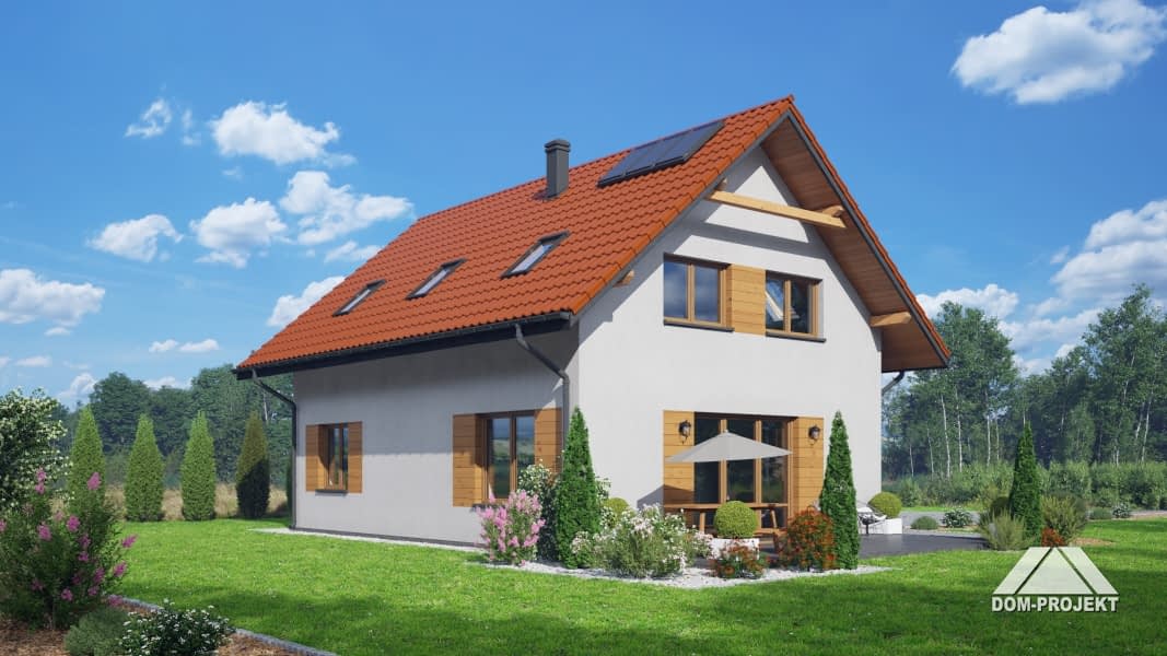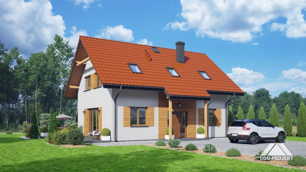 Dom z poddaszem użytkowym. Na parterze salon z aneksem kuchennym, kominkiem oraz wyjściem na taras. Pokój, łazienka, kotłownia, wiatrołap, komunikacja. Na poddaszu cztery pokoje, łazienka, komunikacja. Zwarta bryła budynku oraz dach dwuspadowy sprzyjają szybkiej i taniej budowie oraz niskim kosztom eksploatacji.Rzuty
