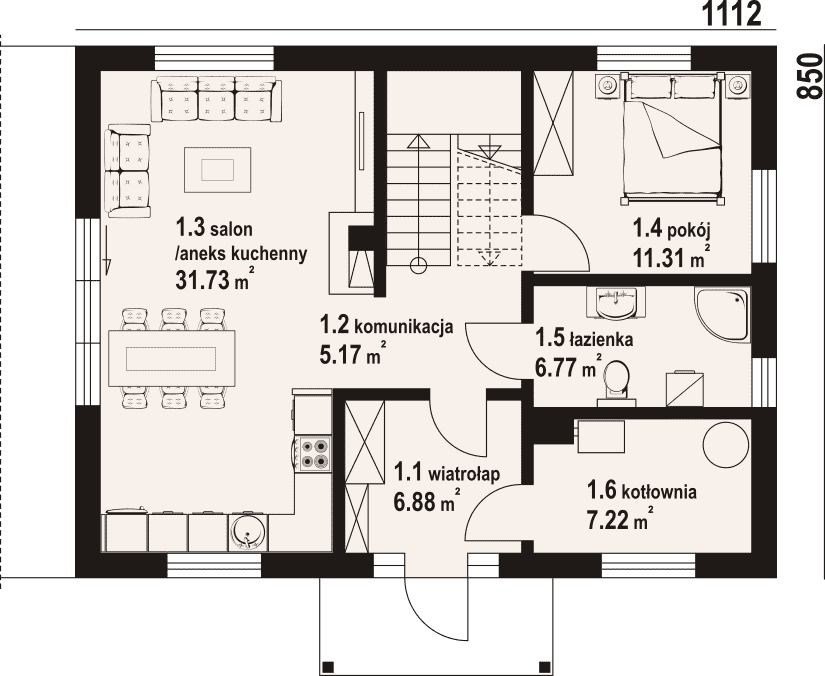 - 1.3 - salon z aneksem kuchennym31.73 m²
