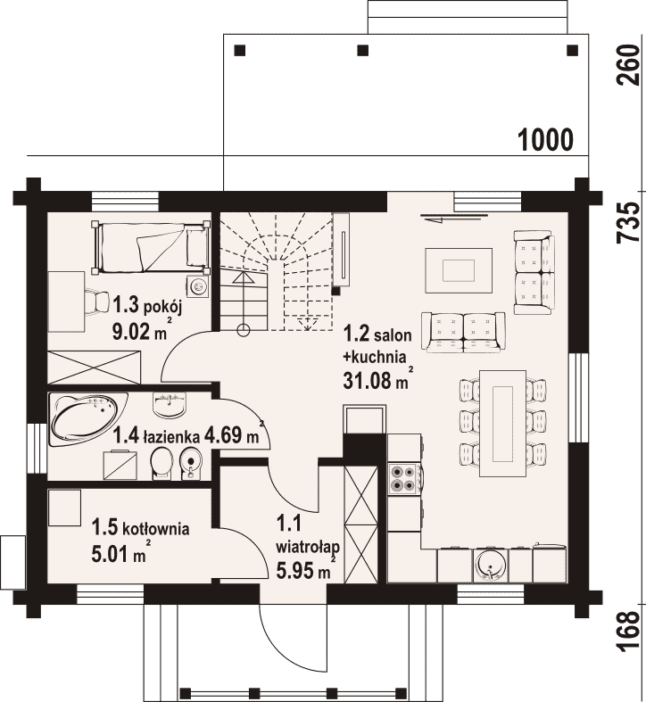 Dom z bali. Na parterze salon z kuchnią, kominkiem, wyjściem na duży, zadaszony taras i schodami na poddasze. Pokój, łazienka, kotłownia. Na poddaszu trzy pokoje, łazienka, komunikacja. Zwarta bryła budynku oraz dach dwuspadowy sprzyjają szybkiej i taniej budowie oraz niskim kosztom eksploatacji.Rzuty