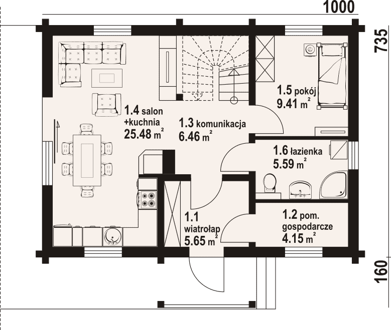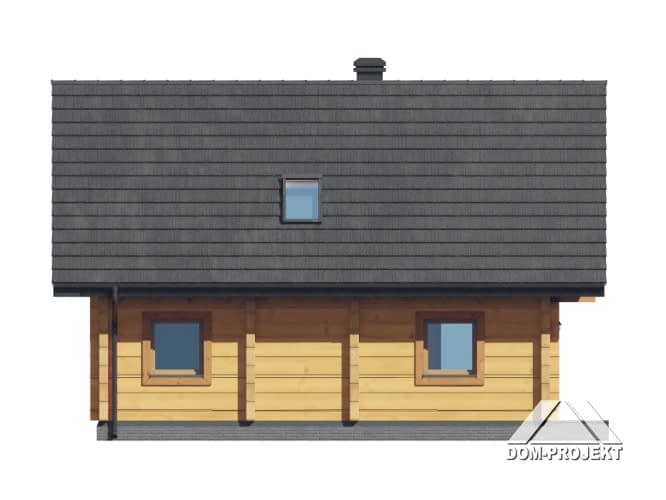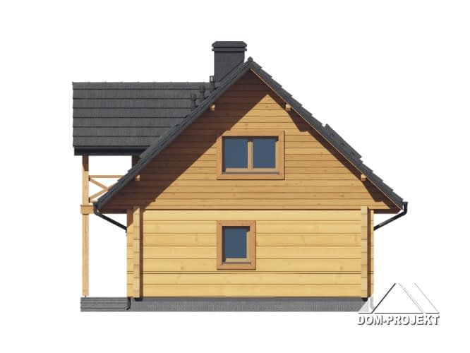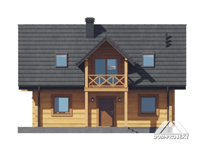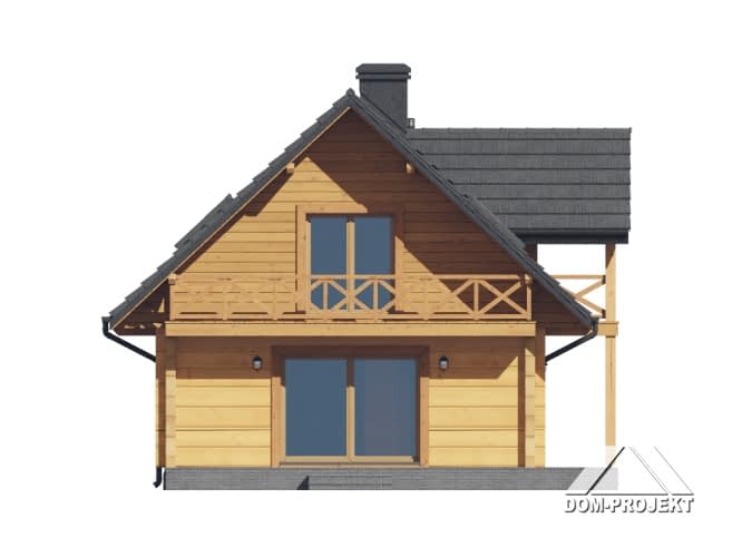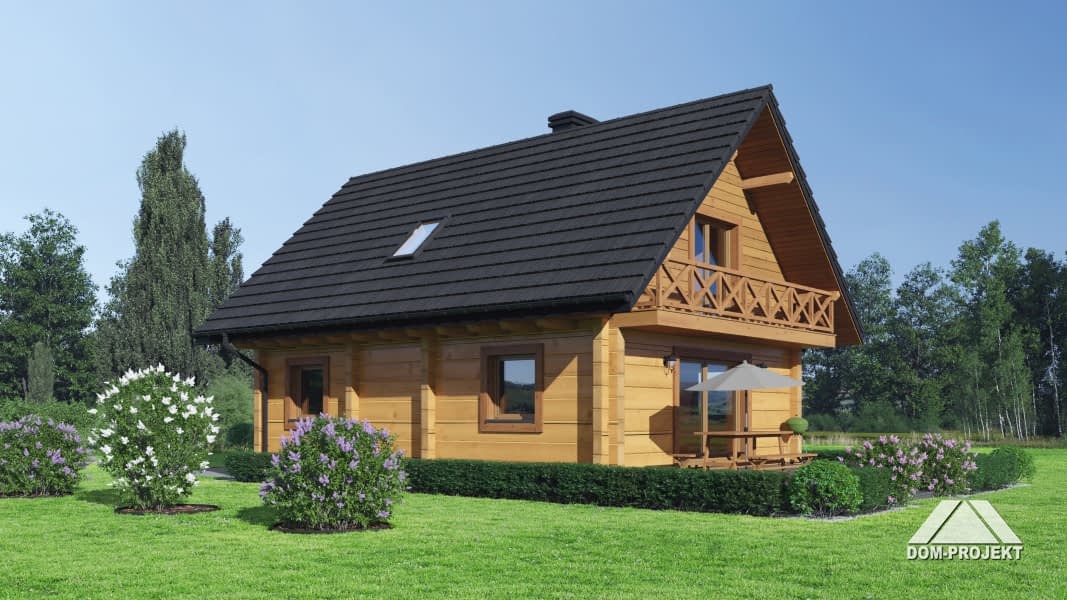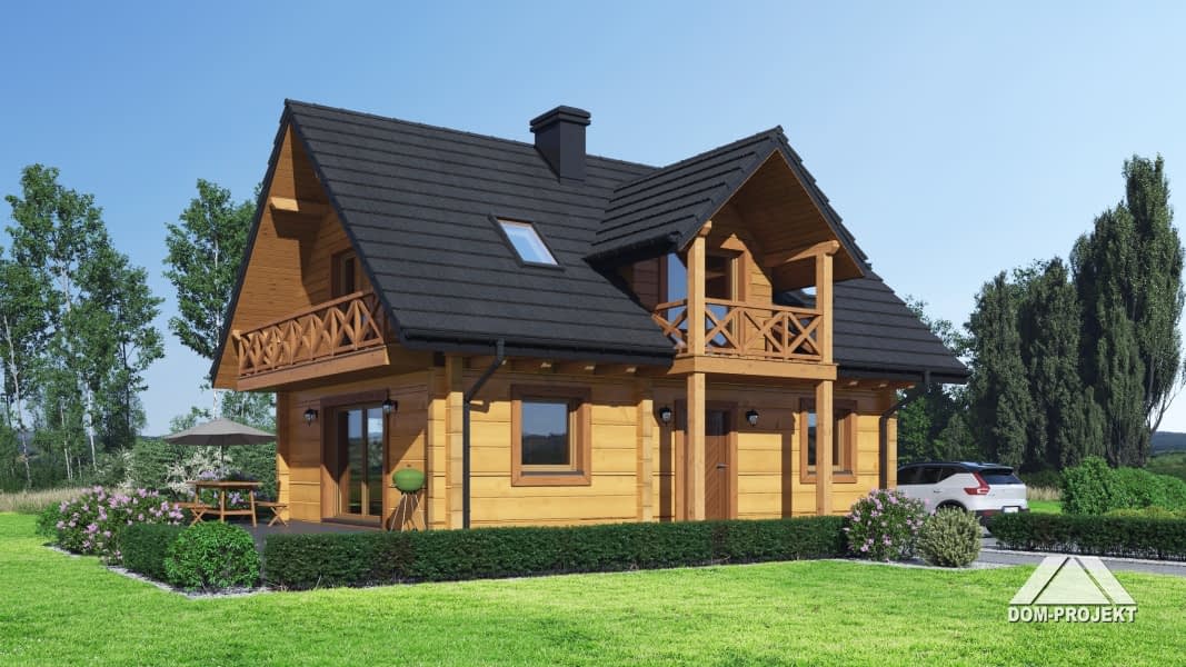Dom z bali drewnianych. Na parterze salon z aneksem kuchennym, kominkiem oraz wyjściem na taras. Pokój, łazienka, pomieszczenie gospodarcze, wiatrołap, komunikacja i schody na poddasze. Na poddaszu dwa pokoje, dwie łazienki, komunikacja oraz dwa balkony. Zwarta bryła budynku oraz dach dwuspadowy sprzyjają szybkiej i taniej budowie oraz niskim kosztom eksploatacji.Rzuty