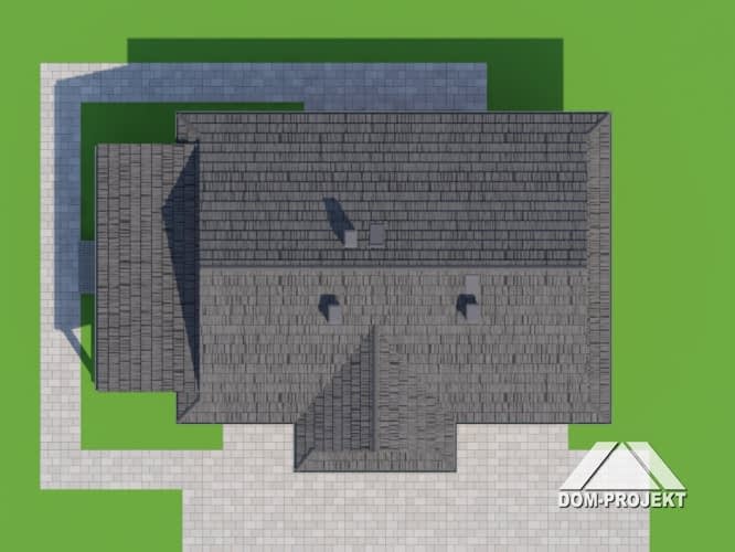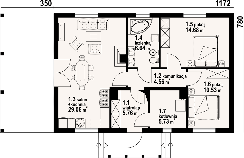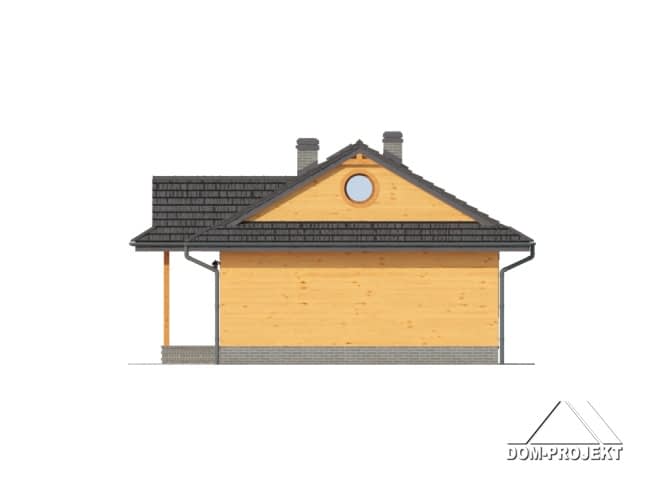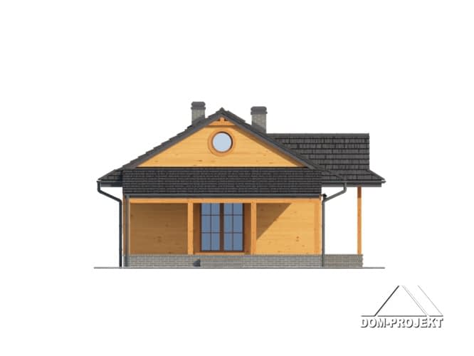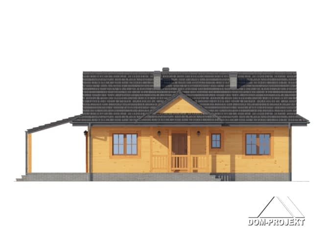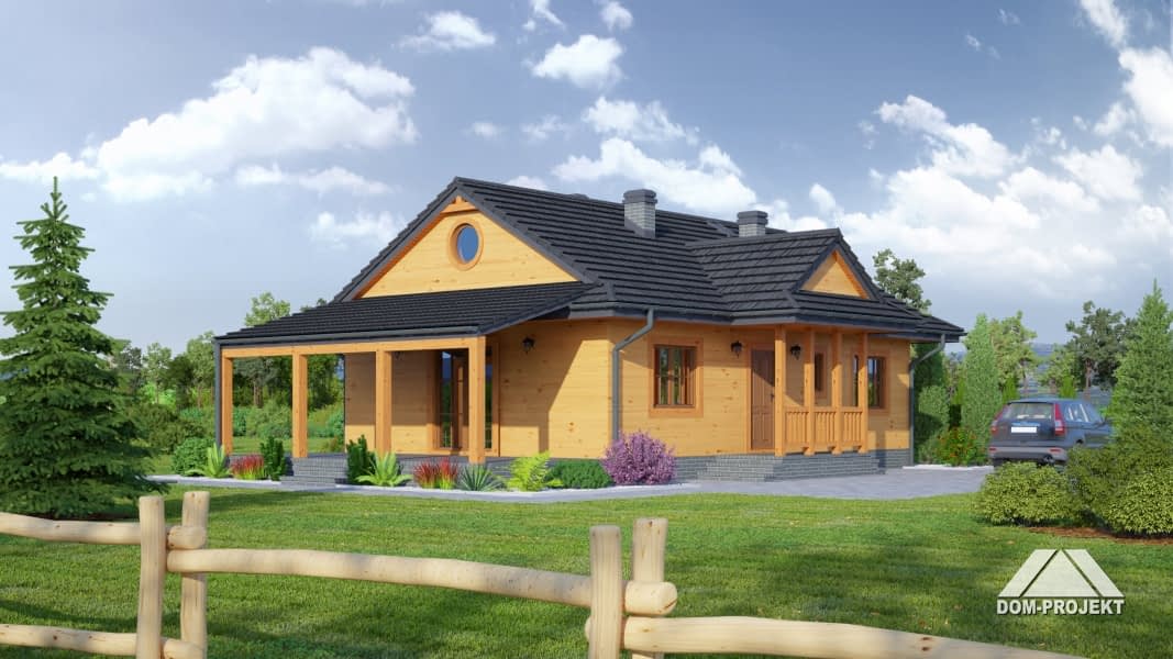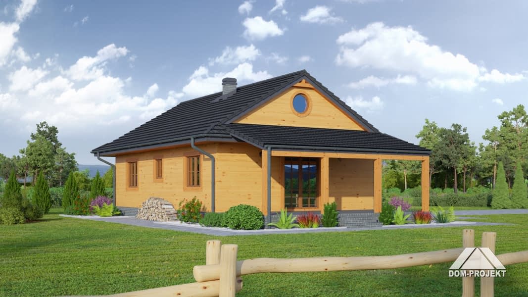 Dom parterowy w konstrukcji szkieletu drewnianego. Duży salon z aneksem kuchennym, kominkiem, wyjściem na duży zadaszony taras. Dwa pokoje, łazienka, komunikacja, kotłownia i wiatrołap. Wejście do domu zadaszone. Poddasze nieużytkowe. Zwarta bryła budynku i dach dwuspadowy sprzyjają szybkiej i taniej budowie i niskim kosztom eksploatacji.Rzuty