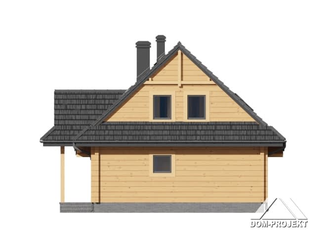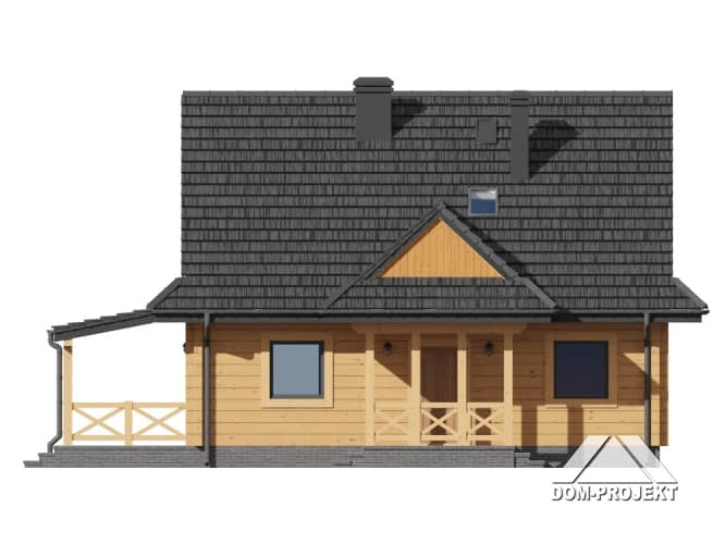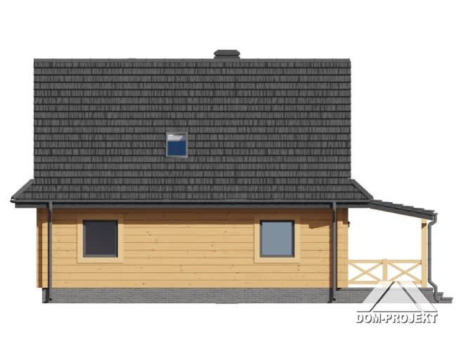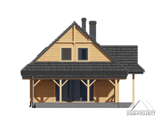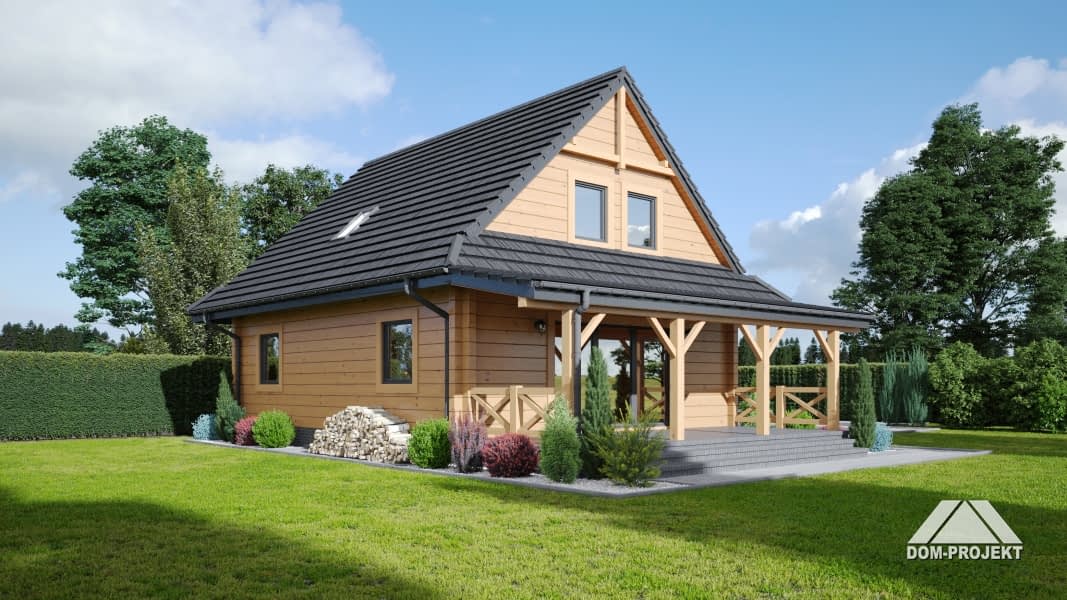 Dom z bali drewnianych. Na parterze duży salon z aneksem kuchennym, kominkiem i wyjściem na zadaszony taras. Pokój, łazienka, kotłownia, wiatrołap. Na poddaszu trzy pokoje, łazienka, komunikacja. Zwarta bryła budynku i dach dwuspadowy sprzyjają szybkiej i taniej budowie i niskim kosztom eksploatacji.Rzuty