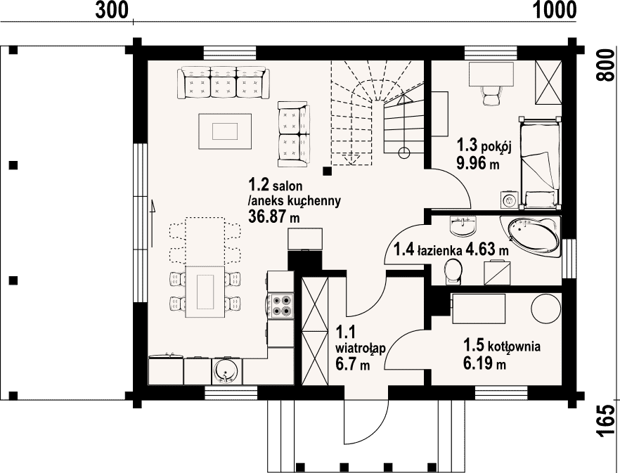 - 1.2 - salon z aneksem kuchennym36.87 m²