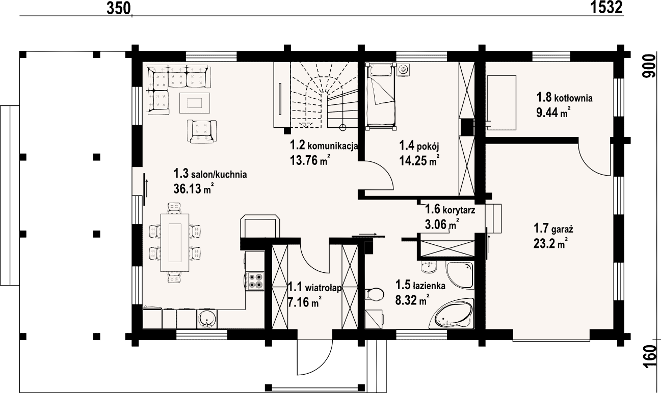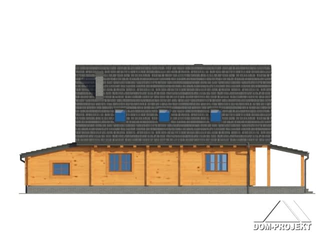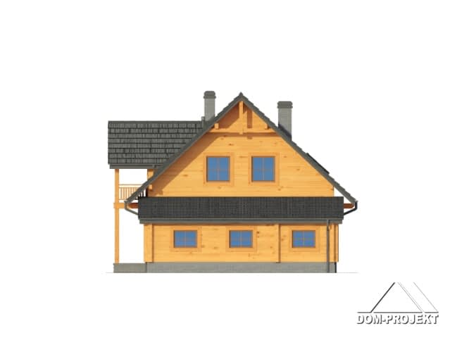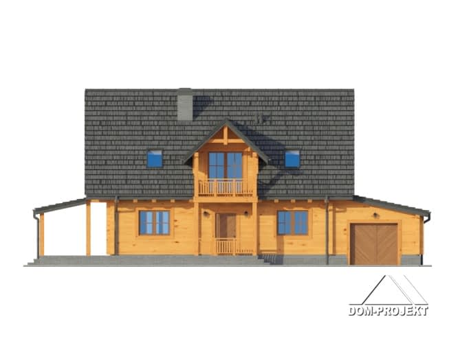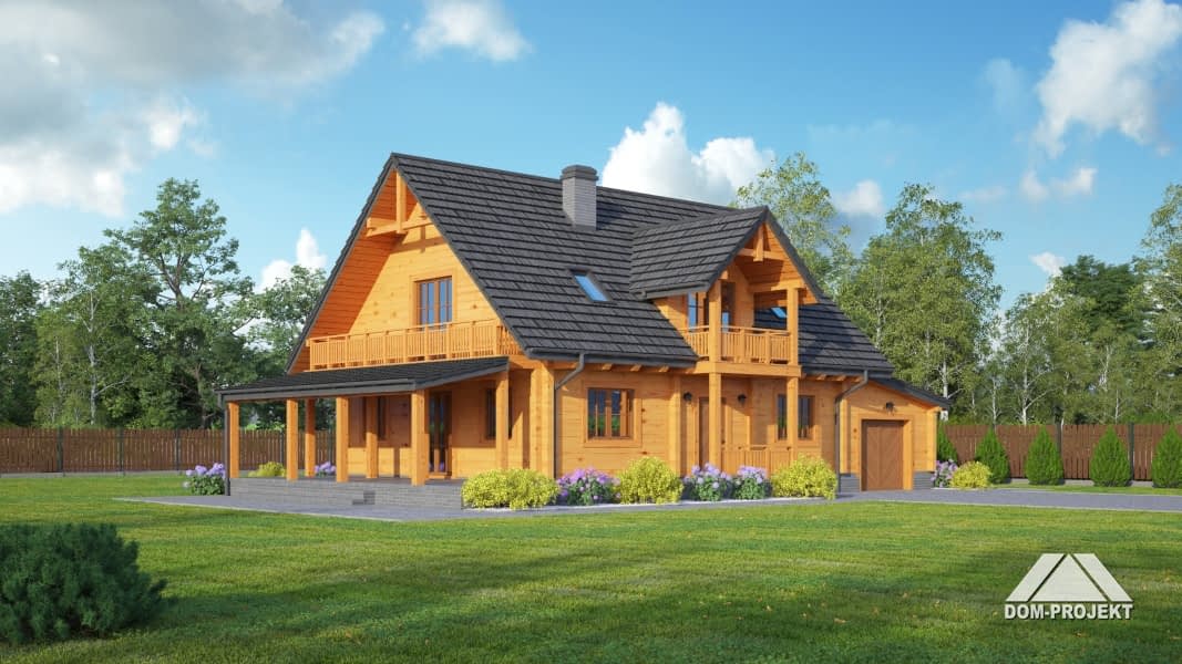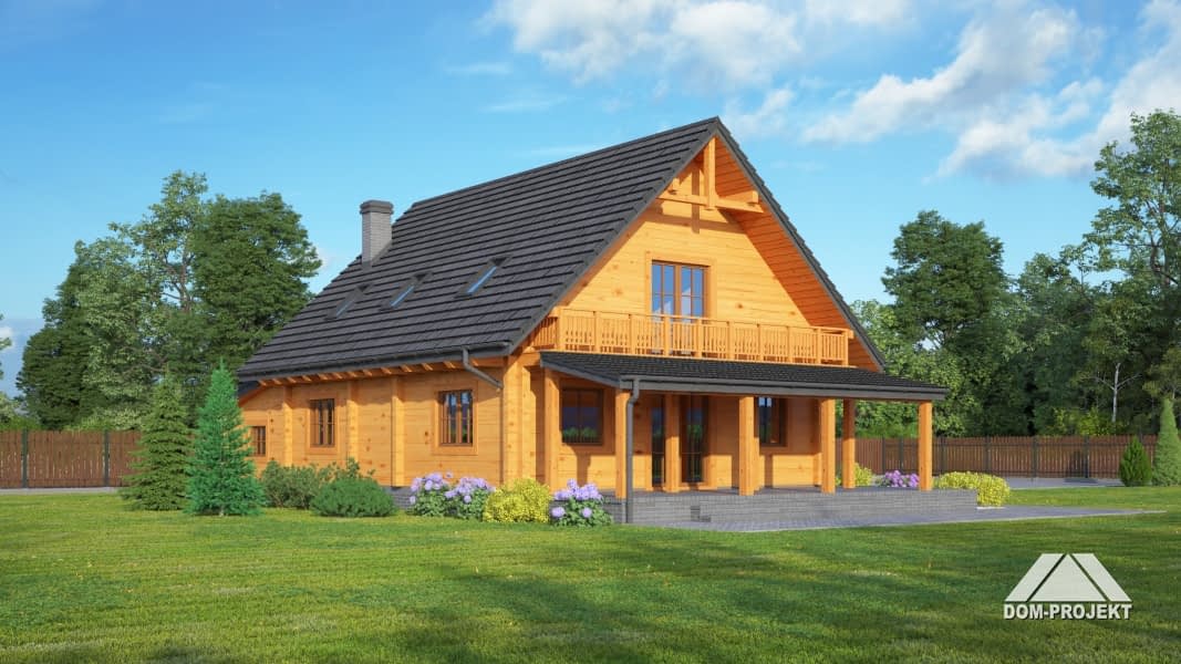 Dom drewniany z bali. Duży salon z aneksem kuchennym, łazienką, schodami na poddasze i zadaszonym tarasem. Pokój, łazienka, wiatrołap, korytarz, garaż i kotłownia. Na poddaszu trzy pokoje, łazienka, komunikacja i dwa balkony. Zwarta bryła budynku i dach dwuspadowy sprzyjają taniej i szybkiej budowie oraz niskim kosztom eksploatacji.Rzuty
