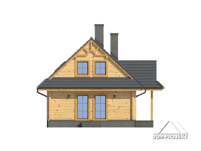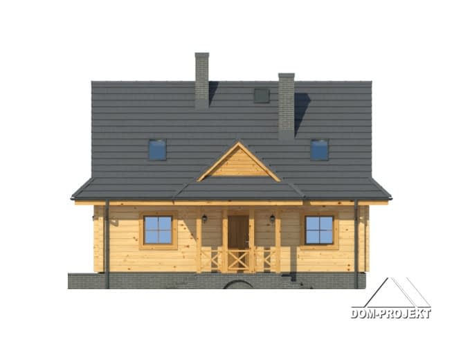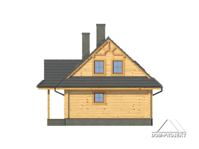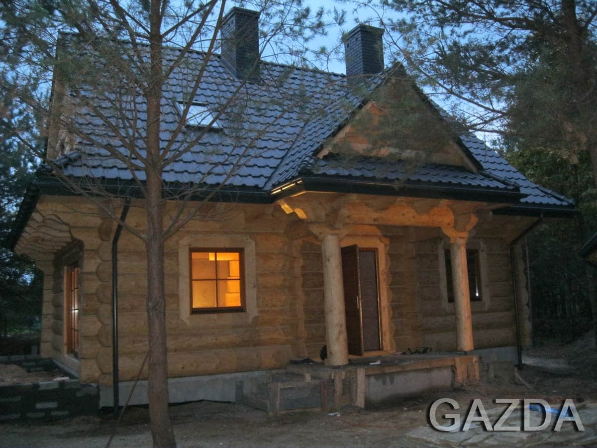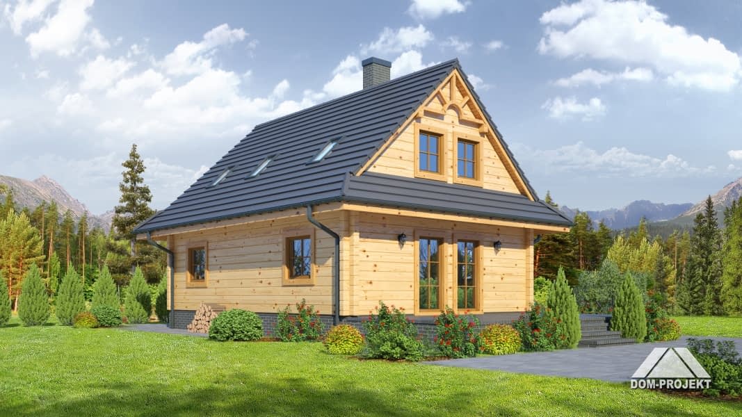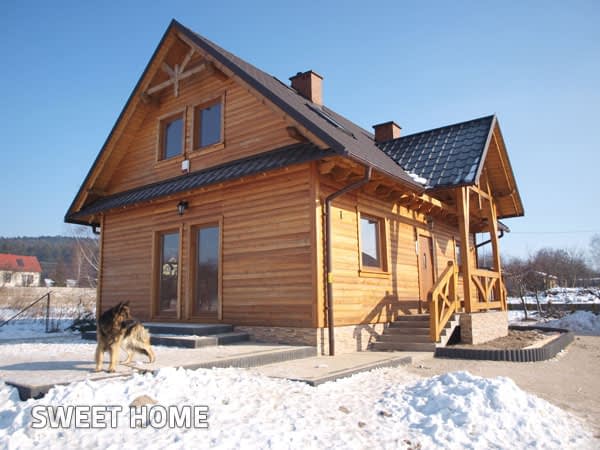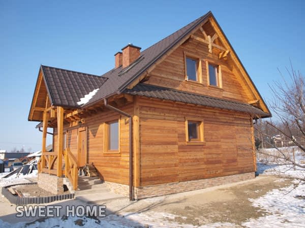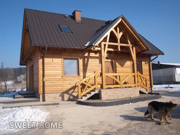 Dom z bali drewnianych . Zewnętrzny wygląd nawiązuje do tradycji domów góralskich a układ funkcjonalny wewnątrz jest współczesny. 5 pokoi, 2 łazienki, kotłownia. Salon z aneksem kuchennym, kominkiem, schodami na poddasze i wyjściem na taras. Pokój, łazienka, wiatrołap, kotłownia. Na poddaszu 3 pokoje i łazienka. Dom mieszkalny, który może być domem letniskowym.Rzuty