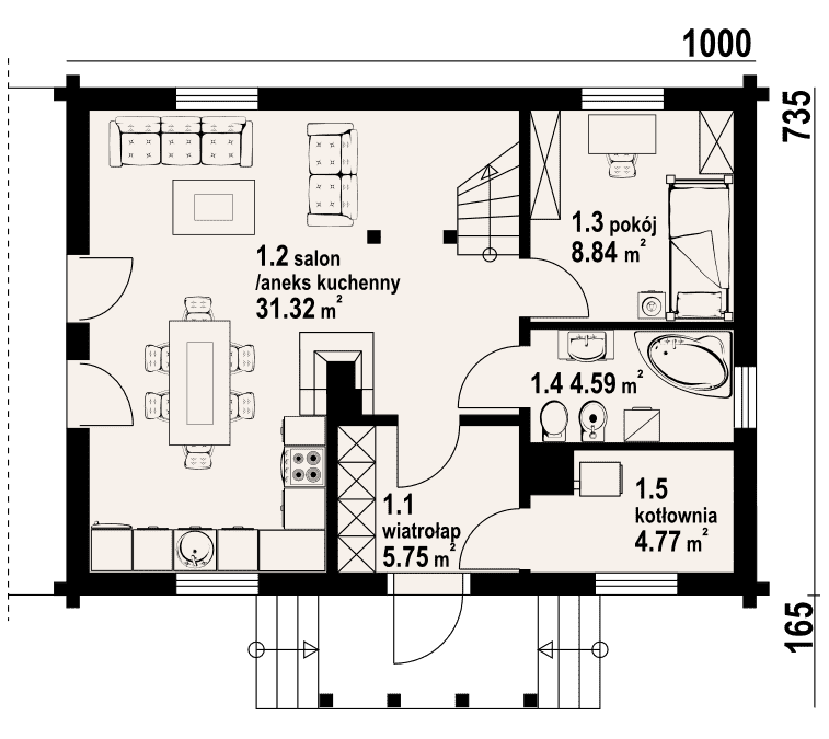 - 1.2 - salon z aneksem kuchennym31.32 m²