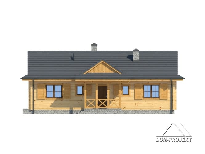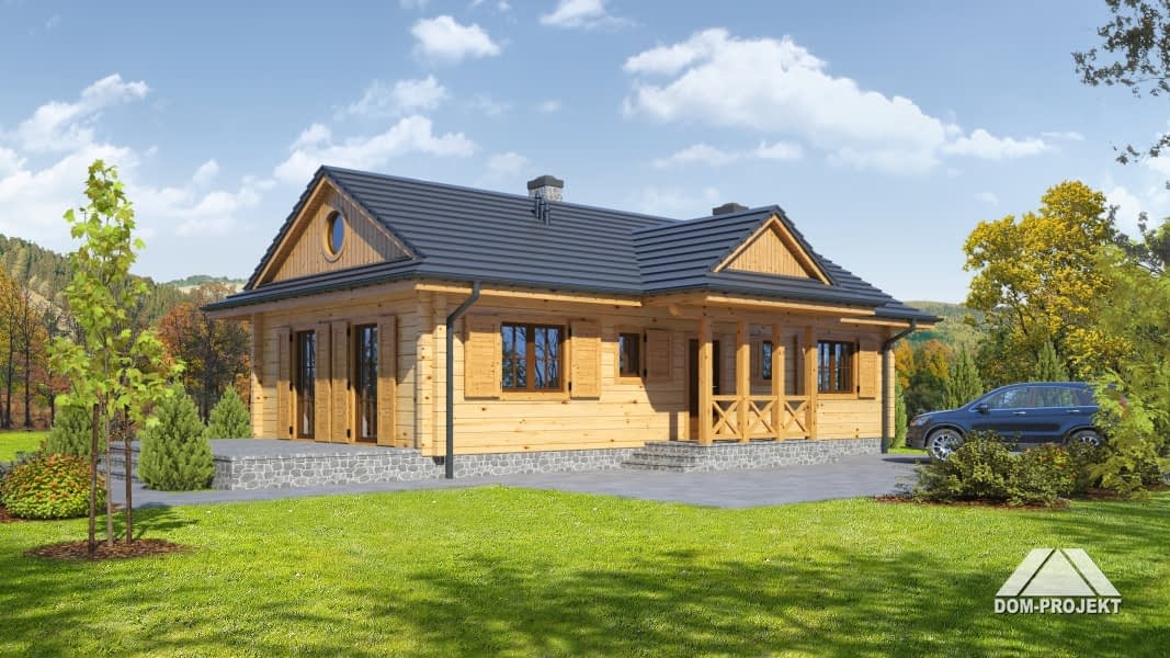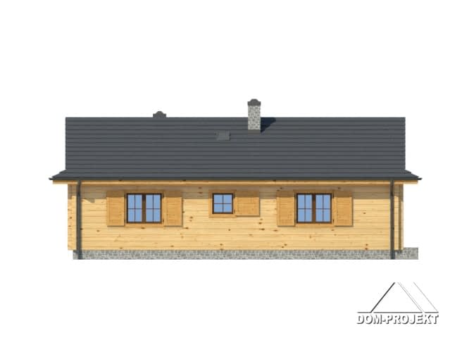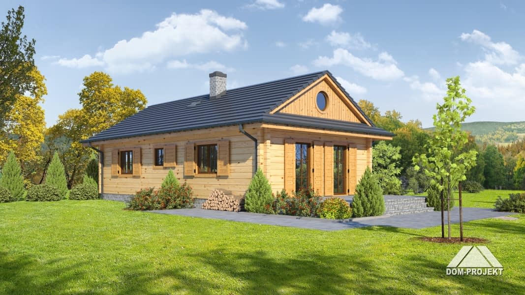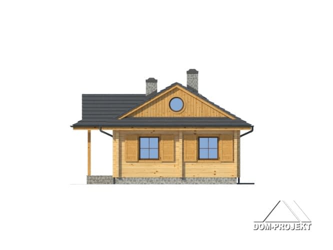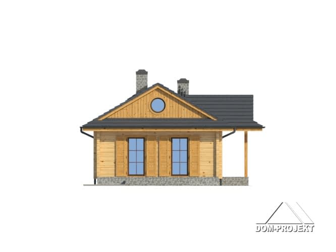 Dom z bali drewnianych.Architektura nawiązuje do domów góralskich. Duży salon z aneksem kuchennym, kominkiem i wyjściem na taras. Dwa pokoje, łazienka, spiżarka, wiatrołap i kotłownia. W kotłowni schody rozkładane na poddasze. Poddasze nieużytkowe.Rzuty