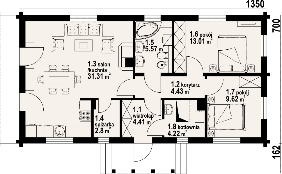 - 1.3 - kuchnia, salon31.31 m²