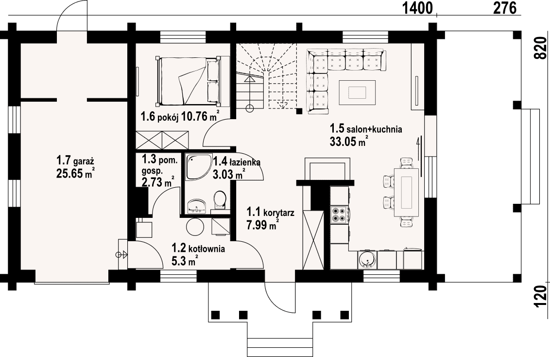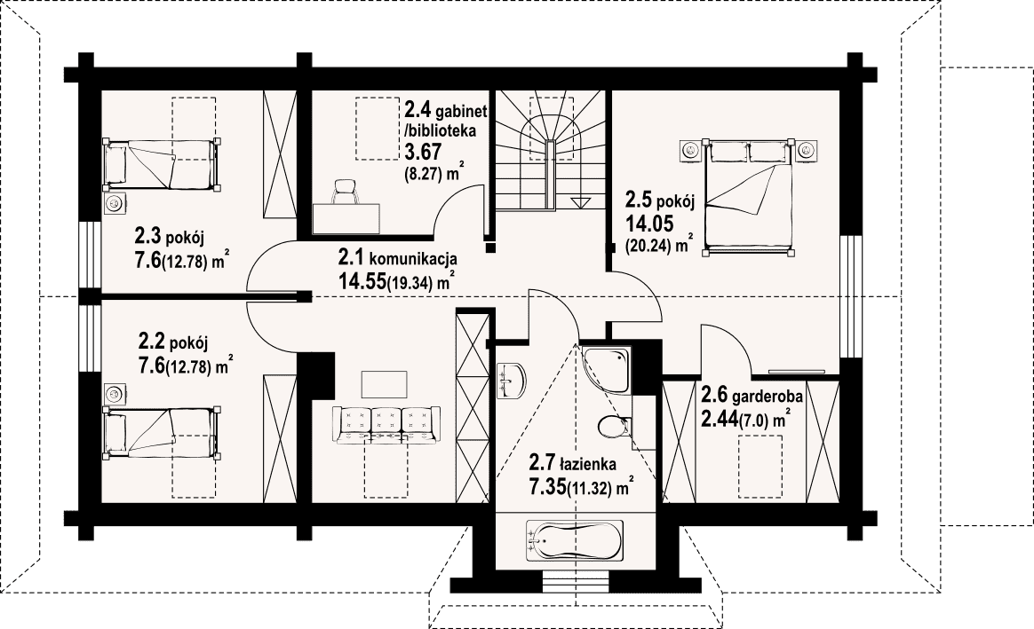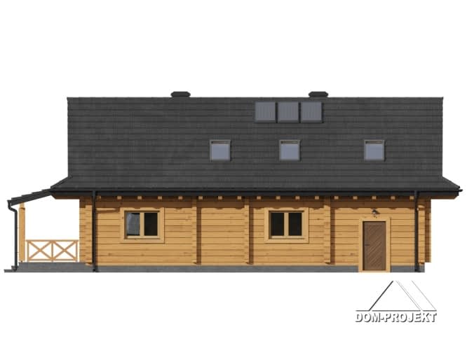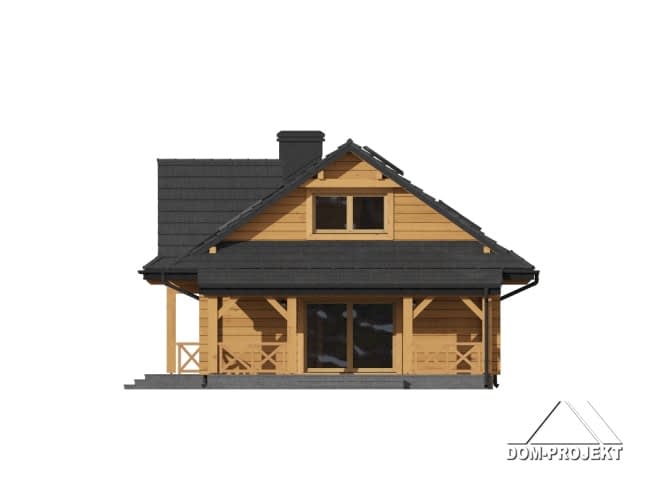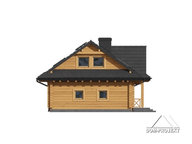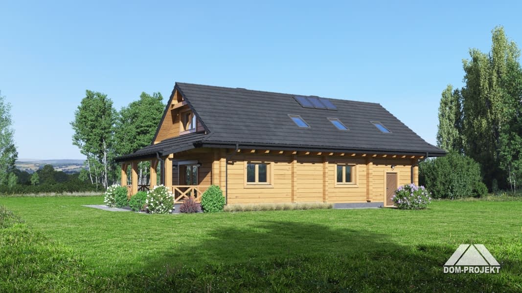 Dom z bali. Na parterze duży salon z kuchnią, kominkiem, schodami na poddasze oraz wyjściem na zadaszony taras. Pokój, łazienka, kotłownia, pomieszczenie gospodarcze, korytarz oraz garaż. Na poddaszu cztery wygodne pokoje, garderoba, łazienka oraz komunikacja. Zwarta bryła budynku oraz dach dwuspadowy sprzyjają szybkiej i taniej budowie oraz niskim kosztom eksploatacji.Rzuty