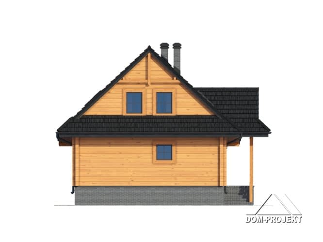 Dom z bali drewnianych. Podpiwniczony. Duży salon z aneksem kuchennym, kominkiem, wyjściem na zadaszony taras i schodami. Pokój, wiatrołap, łazienka, garderoba. Na poddaszu trzy pokoje, łazienka i komunikacja. Zwarta bryła budynku i dach dwuspadowy sprzyjają szybkiej i taniej budowie i niskim kosztom eksploatacji.Rzuty