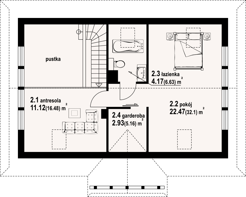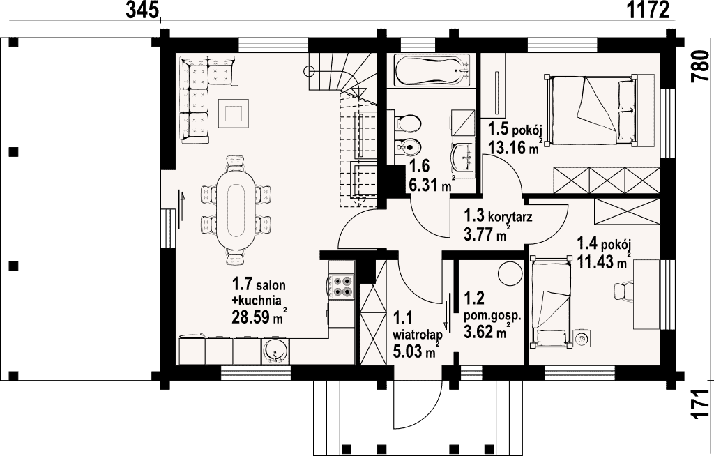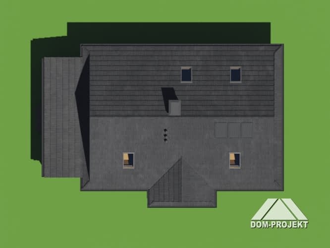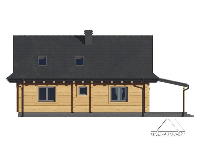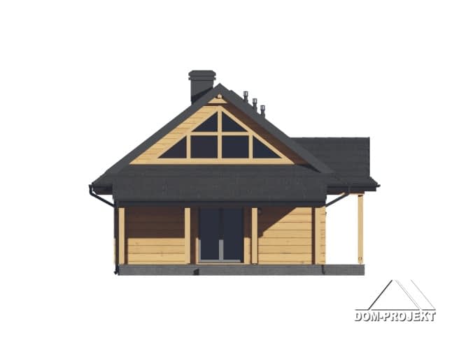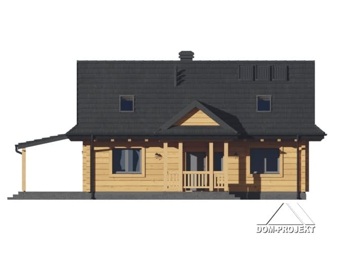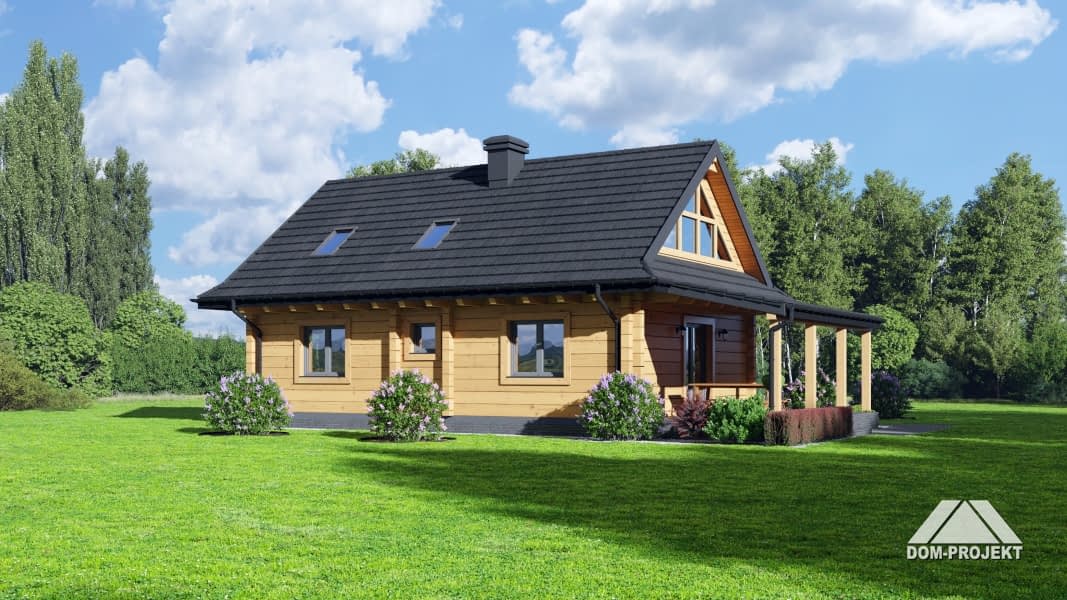 Dom z bali. Na parterze salon z aneksem kuchennym, kominkiem i wyjściem na zadaszony taras. Dwa pokoje, łazienka, pomieszczenie gospodarcze, korytarz, wiatrołap. Na poddaszu pokój, łazienka, garderoba oraz antresola z widokiem na część salonu. Zwarta bryła budynku i dach dwuspadowy sprzyjają szybkiej i taniej budowie oraz niskim kosztom eksploatacji.Rzuty