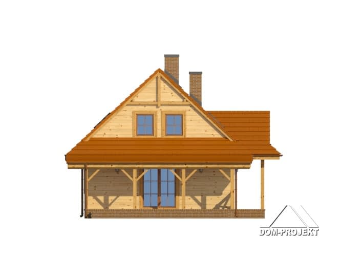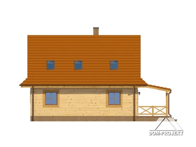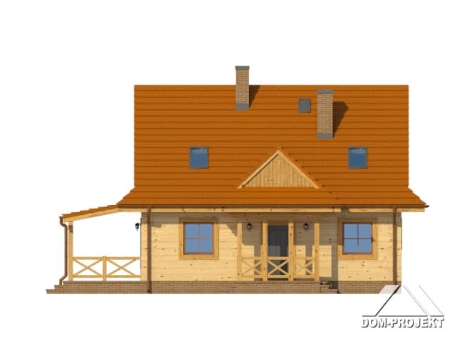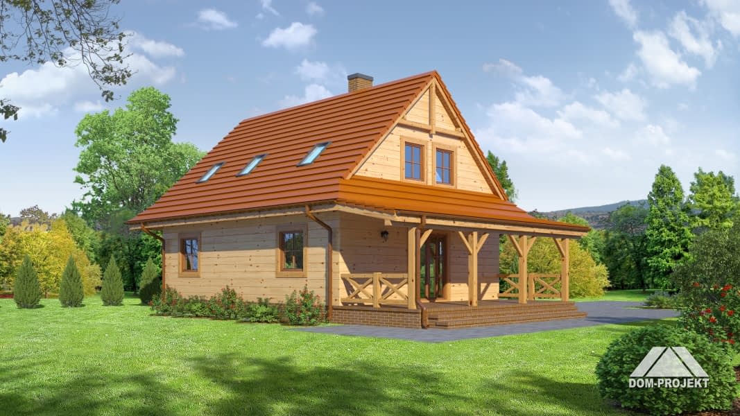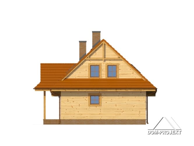 Mały, ale wygodny dom w szkielecie drewnianym. Architektura zewnętrzna nawiązuje do tradycyjnych domów góralskich. Duży salon z aneksem kuchennym, kominkiem, schodami na poddasze i wyjściem na taras. Pokój, łazienka, kotłownia i wiatrołap z miejscem na szafę. Na poddaszu trzy pokoje, łazienka i komunikacja.Rzuty