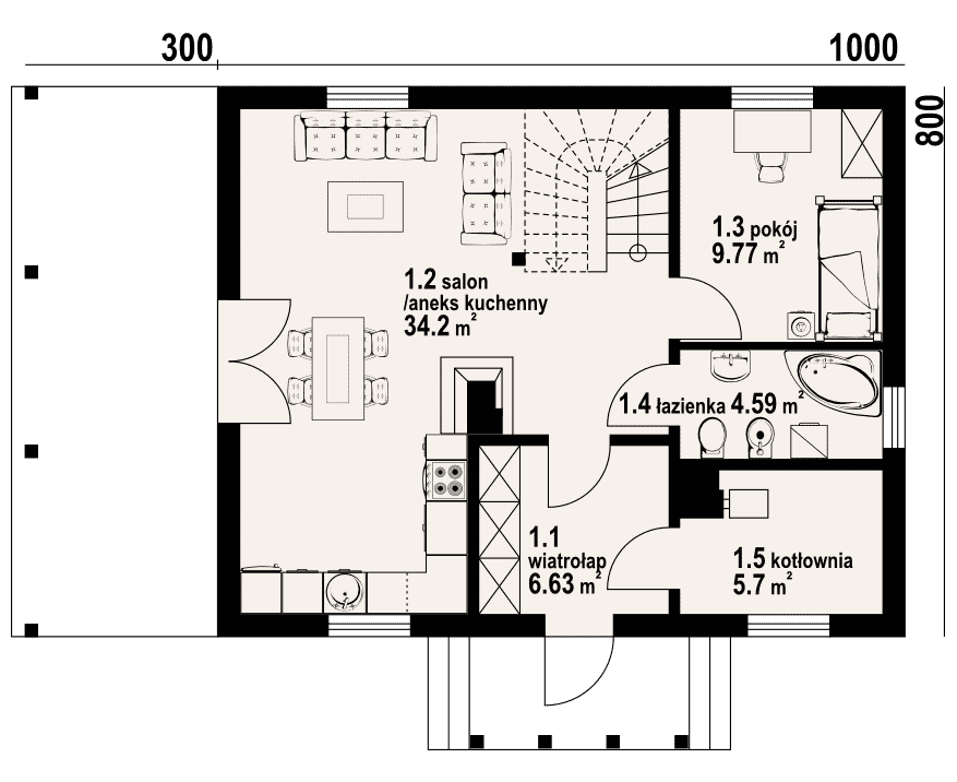 - 1.2 - salon z aneksem kuchennym34.2 m²