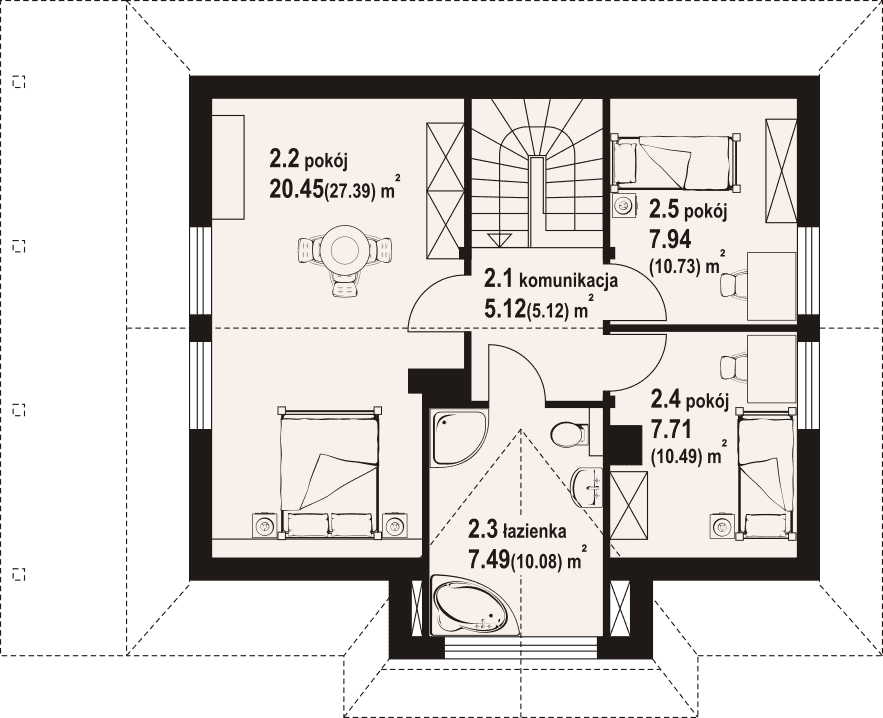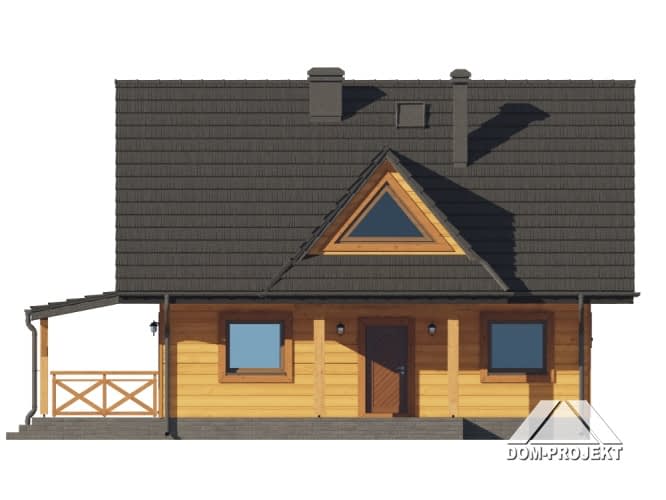 Dom w konstrukcji szkieletu drewnianego. Na parterze duży salon z aneksem kuchennym, kominkiem, wyjściem na duży, zadaszony taras i schodami na poddasze. Pokój, łazienka, kotłownia, wiatrołap. Na poddaszu trzy pokoje, komunikacja, duża łazienka. Zwarta bryła budynku oraz dach dwuspadowy sprzyjają szybkiej i taniej budowie oraz niskim kosztom eksploatacji.Rzuty