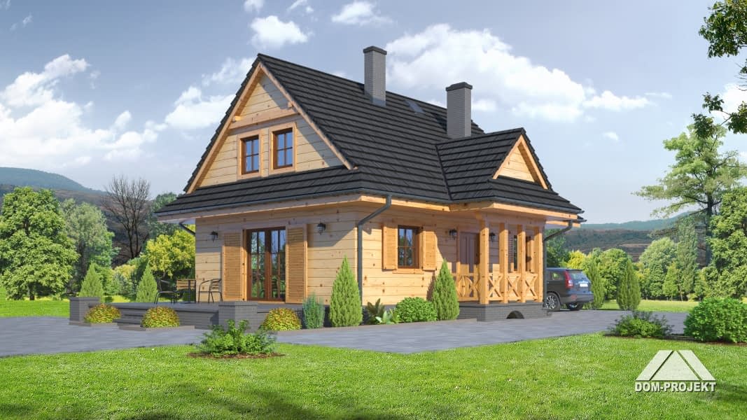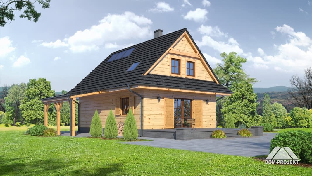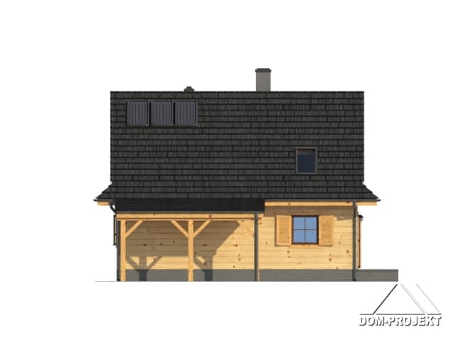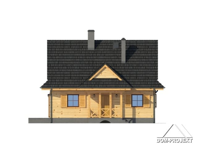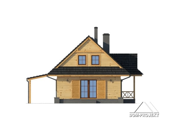 Mały, ale wygodny dom w szkielecie drewnianym. Architektura zewnętrzna nawiązuje do tradycyjnych domów góralskich. Duży salon z aneksem kuchennym, kominkiem, schodami na poddasze i wyjściem na taras. Pokój, łazienka, kotłownia i wiatrołap z miejscem na szafę. Na poddaszu trzy pokoje, łazienka i komunikacja.Rzuty