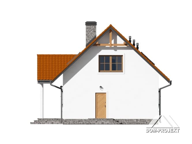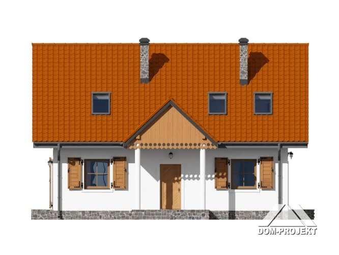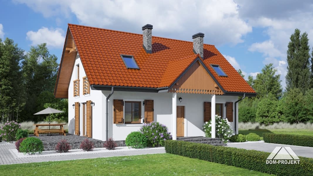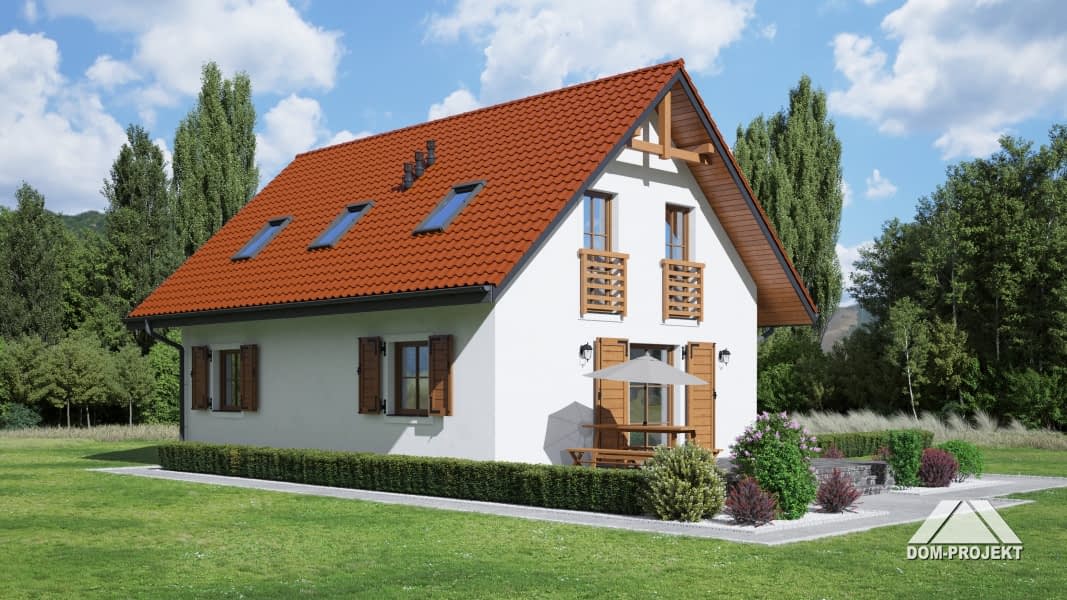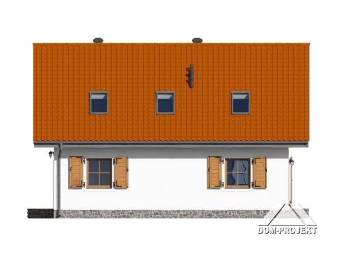 Dom z poddaszem użytkowym. Na parterze salon z aneksem kuchennym, kominkiem oraz wyjściem na taras. Pokój, łazienka, pomieszczenie gospodarcze, spiżarka, wiatrołap. Na poddaszu trzy pokoje, łazienka, pralnia, garderoba oraz komunikacja. Zwarta bryła budynku i dach dwuspadowy sprzyjają szybkiej i taniej budowie i niskim kosztom eksploatacji.Rzuty