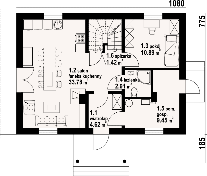 - 1.2 - salon z aneksem kuchennym33.78 m²