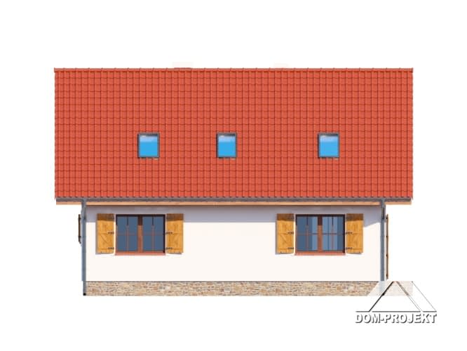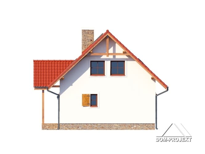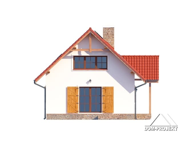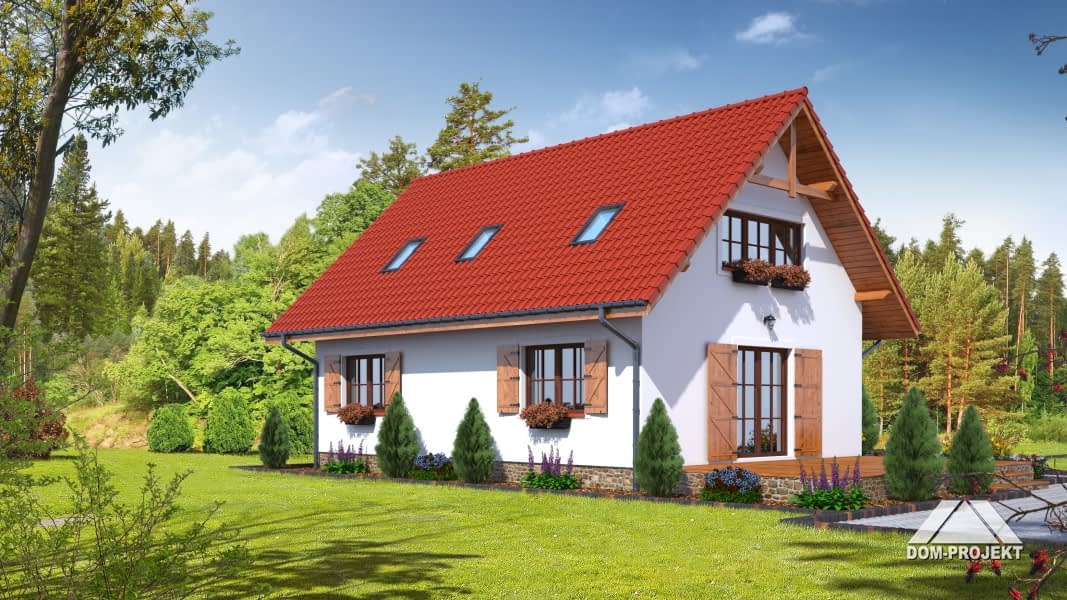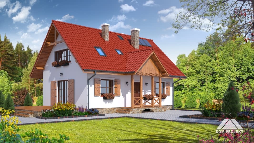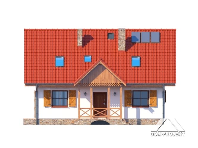 Nieduży dom dla 4-5 osobowej rodziny. Zewnętrzny wygląd nawiązuje do tradycyjnej zabudowy, a wewnętrzny układ funkcjonalny jest współczesny. 5 pokoi, 2 łazienki, kotłownia, wiatrołap (szafy). Salon z aneksem kuchennym, kominkiem, schodami na poddasze i wyjściem na taras. Dom mieszkalny, który może być domem letniskowym. Dom tani w budowie i eksploatacji.Rzuty