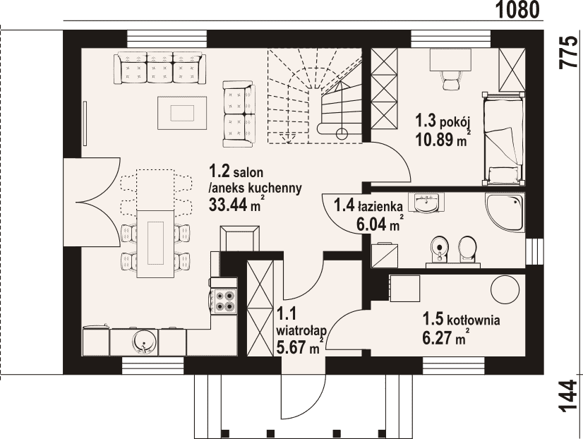 - 1.2 - salon z aneksem kuchennym33.44 m²